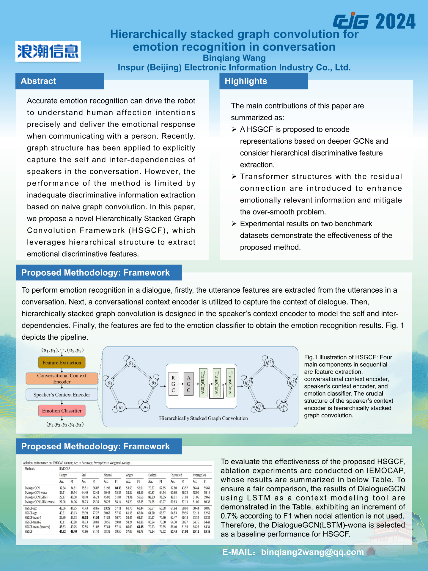 | P001 | Hierarchically stacked graph convolution for emotion recognition in conversation | 王斌强、董刚、赵雅倩、李仁刚、曹其春、胡克坤、蒋东东 | Knowledge-Based Systems | 查看 |