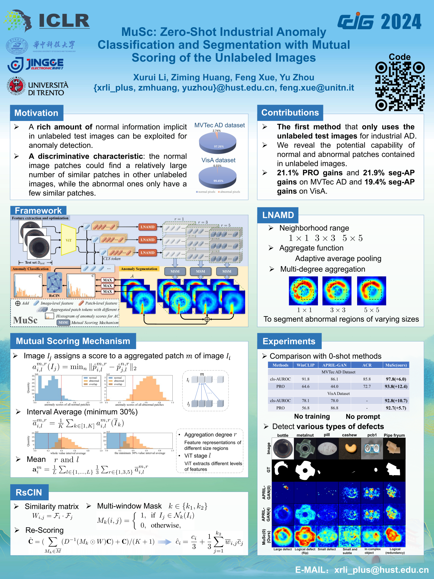 | P002 | MuSc: Zero-Shot Industrial Anomaly Classification and Segmentation with Mutual Scoring of the Unlabeled Images | 李煦蕤、黄子鸣、薛峰、周瑜 | ICLR | 查看 |