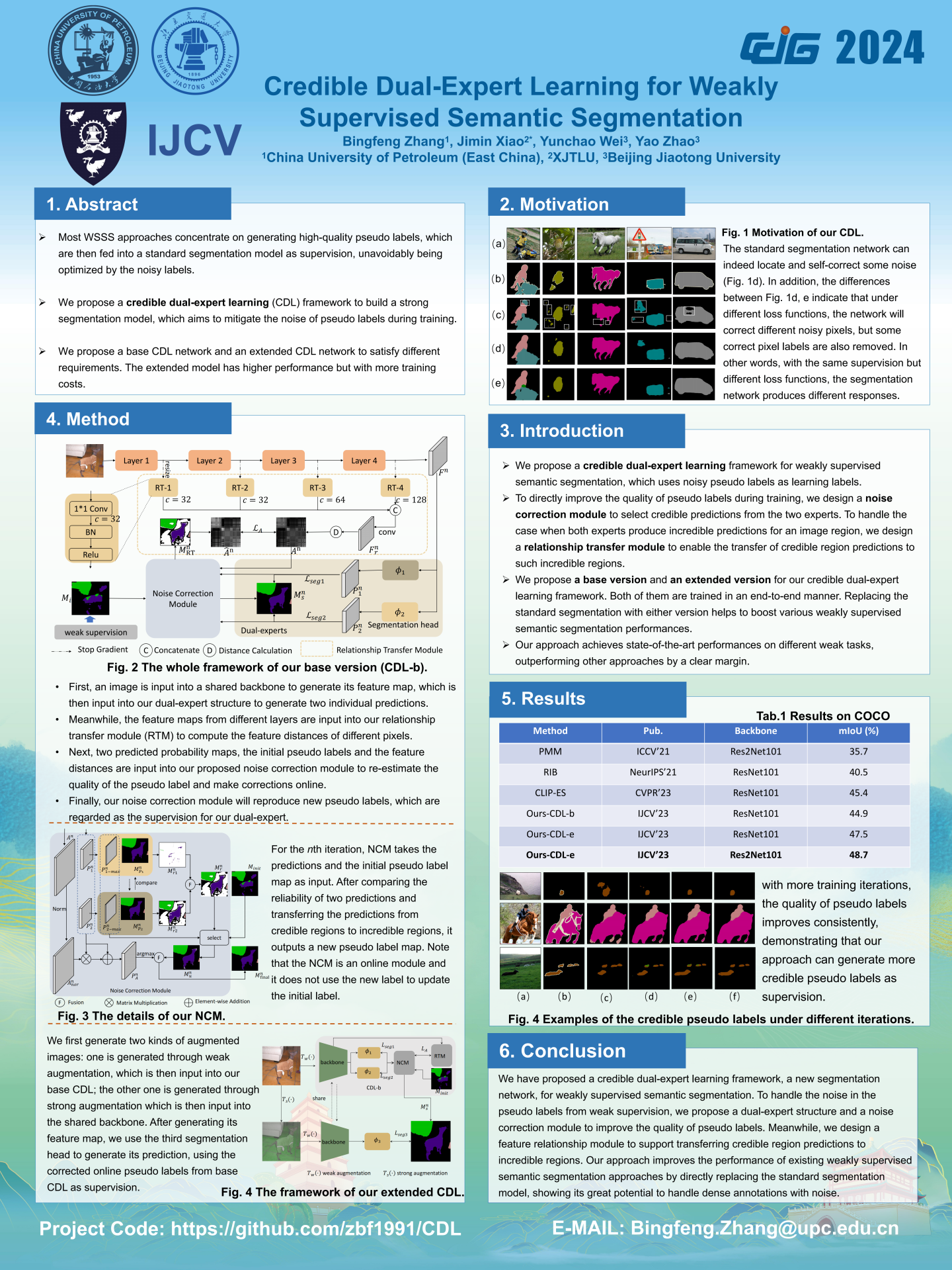 | P003 | Credible Dual-Expert Learning for Weakly Supervised Semantic Segmentation | 张冰峰、肖继民、魏云超、赵耀 | IJCV | 查看 |