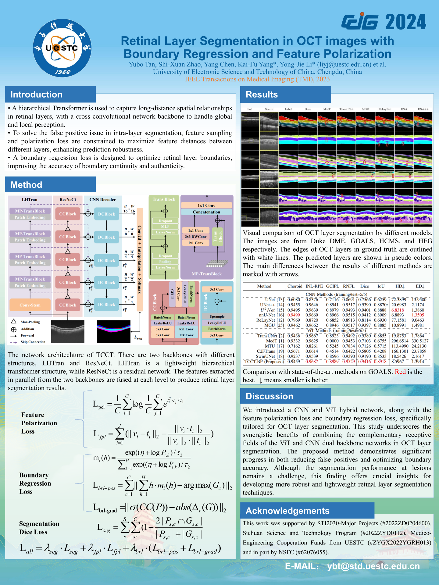 | P010 | Retinal Layer Segmentation in OCT images with Boundary Regression and Feature Polarization | 谭玉博、申文达、武铭远、刘桂娜、赵世轩、陈杨、杨开富、李永杰 | IEEE TMI | 查看 |