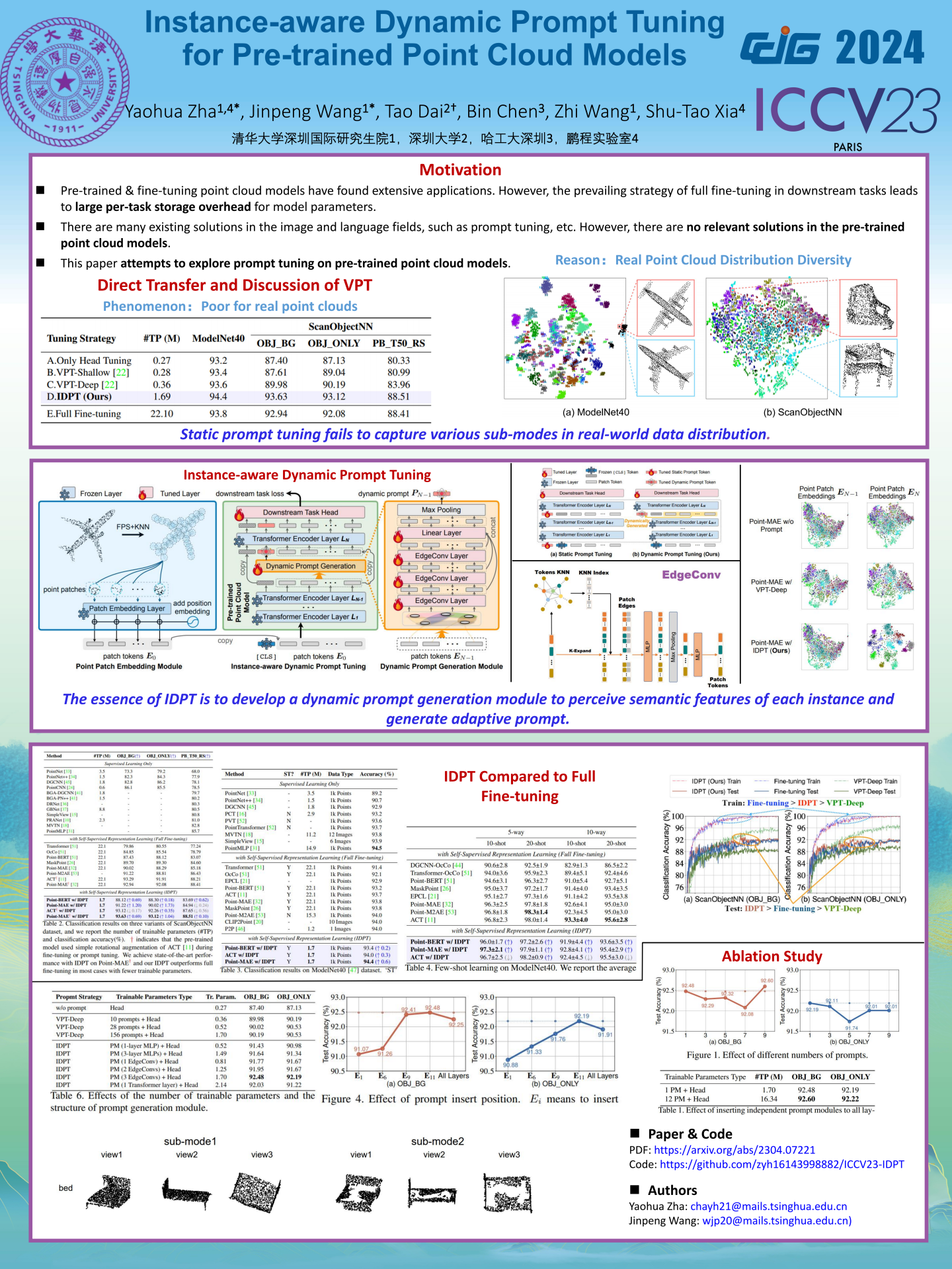 | P101 | Instance-aware Dynamic Prompt Tuning for Pre-trained Point Cloud Models | 查耀华、王锦鹏、戴涛、陈斌、王智、夏树涛 | ICCV | 查看 |