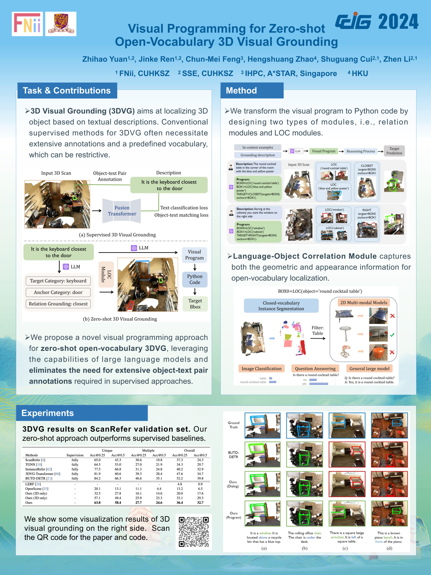 | P103 | Visual Programming for Zero-shot Open-Vocabulary 3D Visual Grounding | 袁之浩、任金科、冯春梅、赵恒爽、崔曙光、李镇 | CVPR | 查看 |