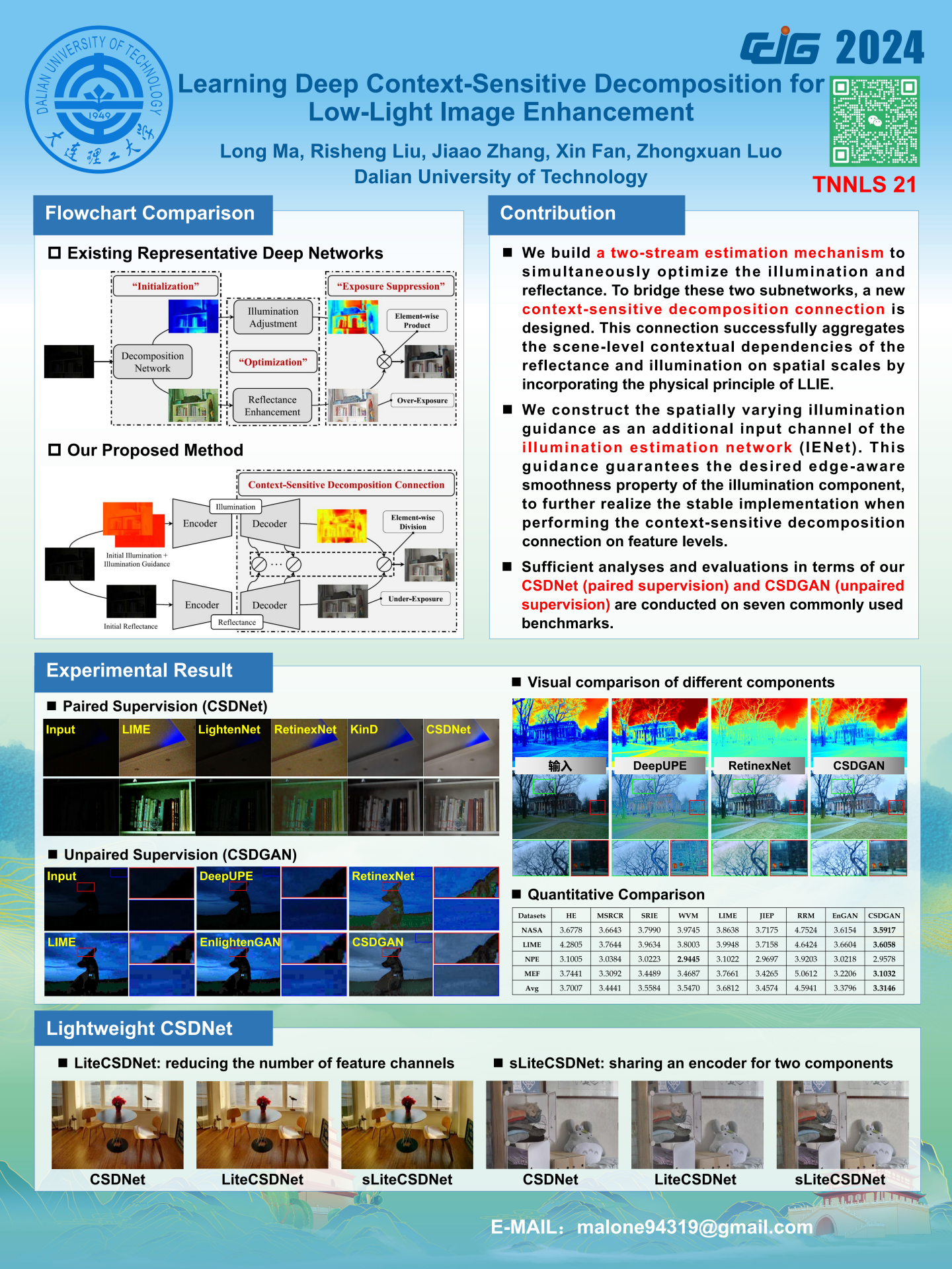 | P104 | Learning Deep Context-Sensitive Decomposition for Low-Light Image Enhancement | 马龙、刘日升、张嘉奥、樊鑫、罗钟铉 | IEEE TNNLS | 查看 |