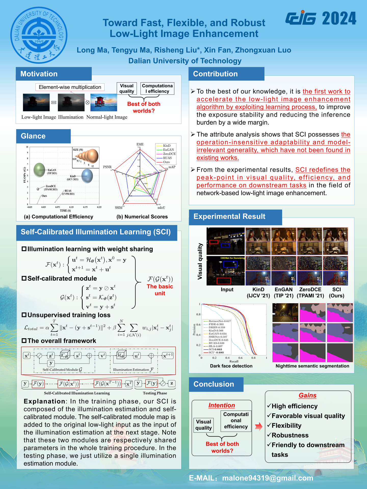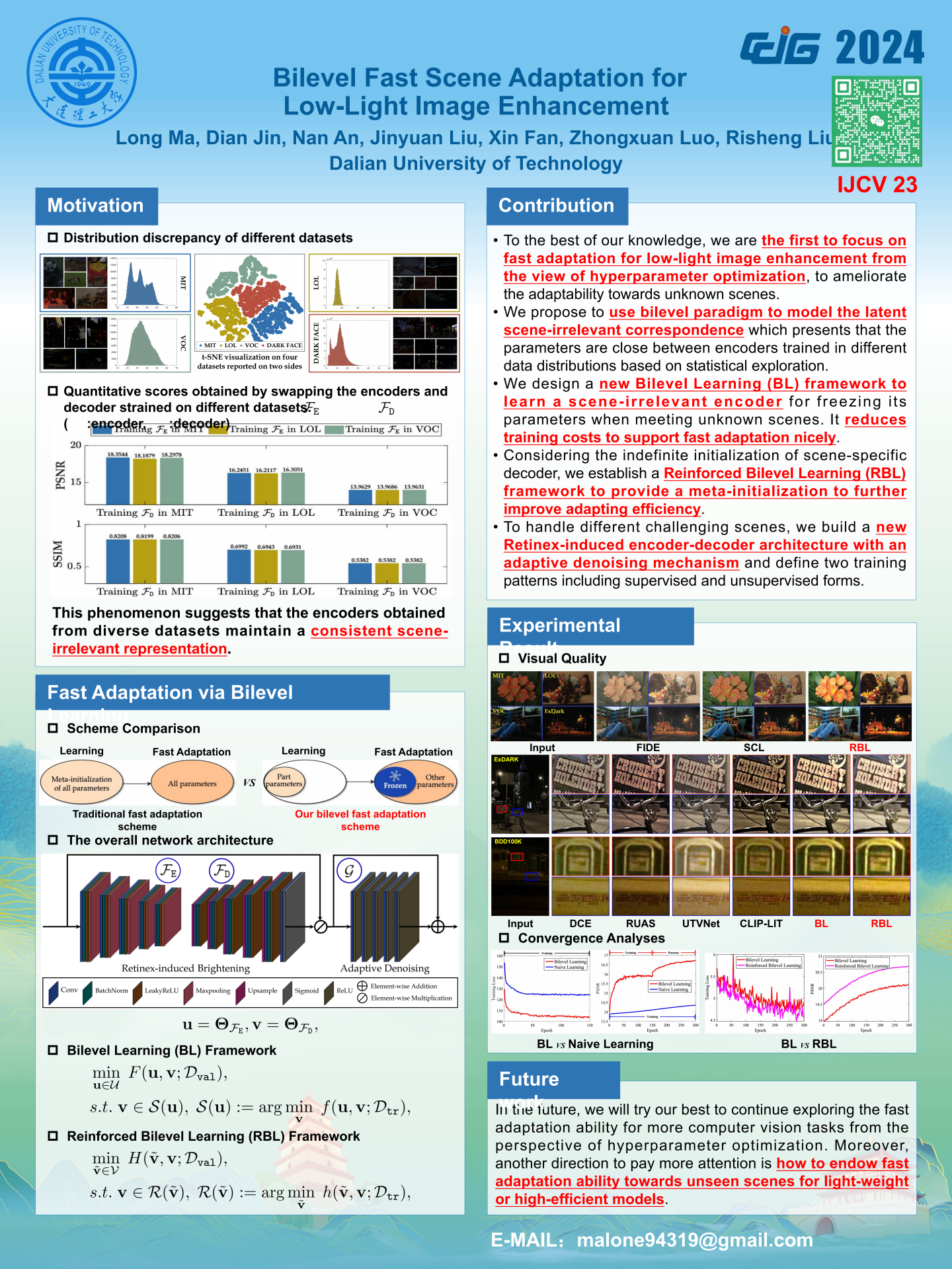 | P105 | Bilevel Fast Scene Adaptation for Low-Light Image Enhancement | 马龙、金典、安南、刘晋源、樊鑫、罗钟铉、刘日升 | IJCV | 查看 |