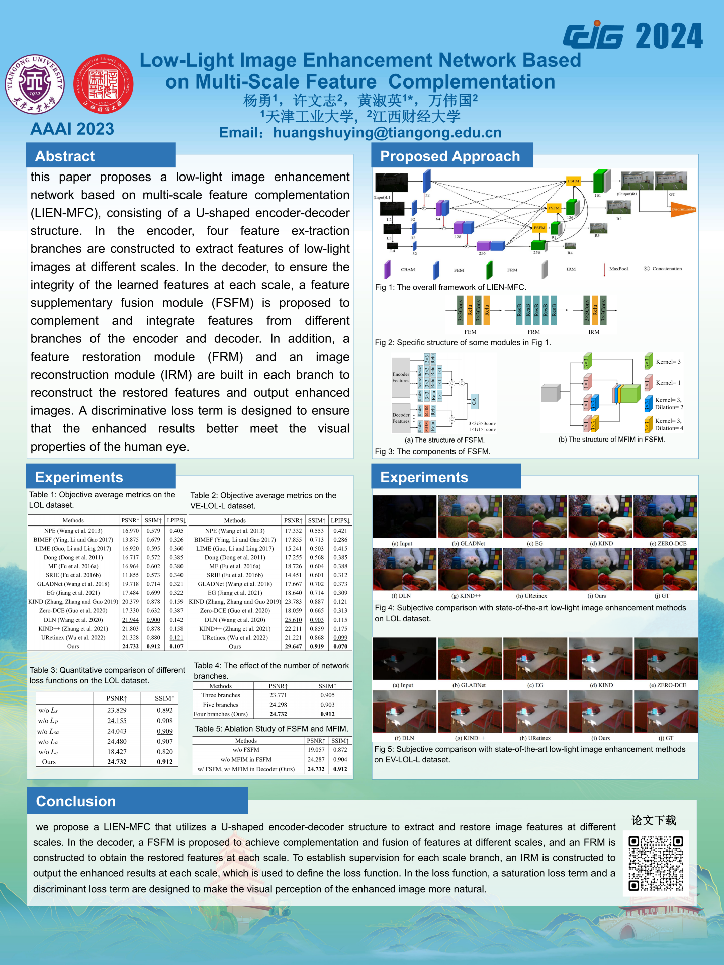 | P106 | Low-Light Image Enhancement Network Based on Multi-Scale Feature Complementation | 杨勇,许文志,黄淑英,万伟国 | AAAI | 查看 |
