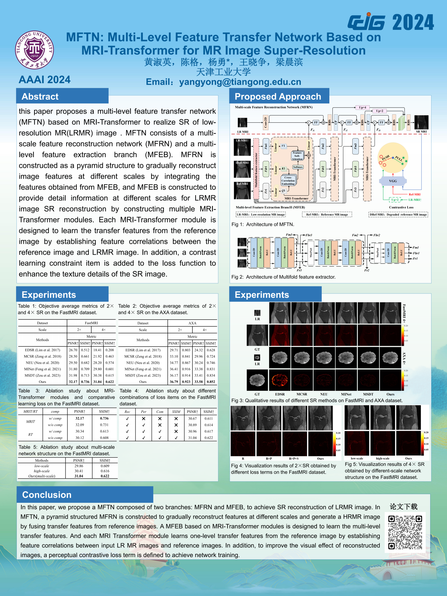 | P107 | MFTN: Multi-Level Feature Transfer Network Based on MRI-Transformer for MR Image Super-Resolution | 黄淑英,陈格,杨勇 ,王晓争,梁晨滨 | AAAI | 查看 |