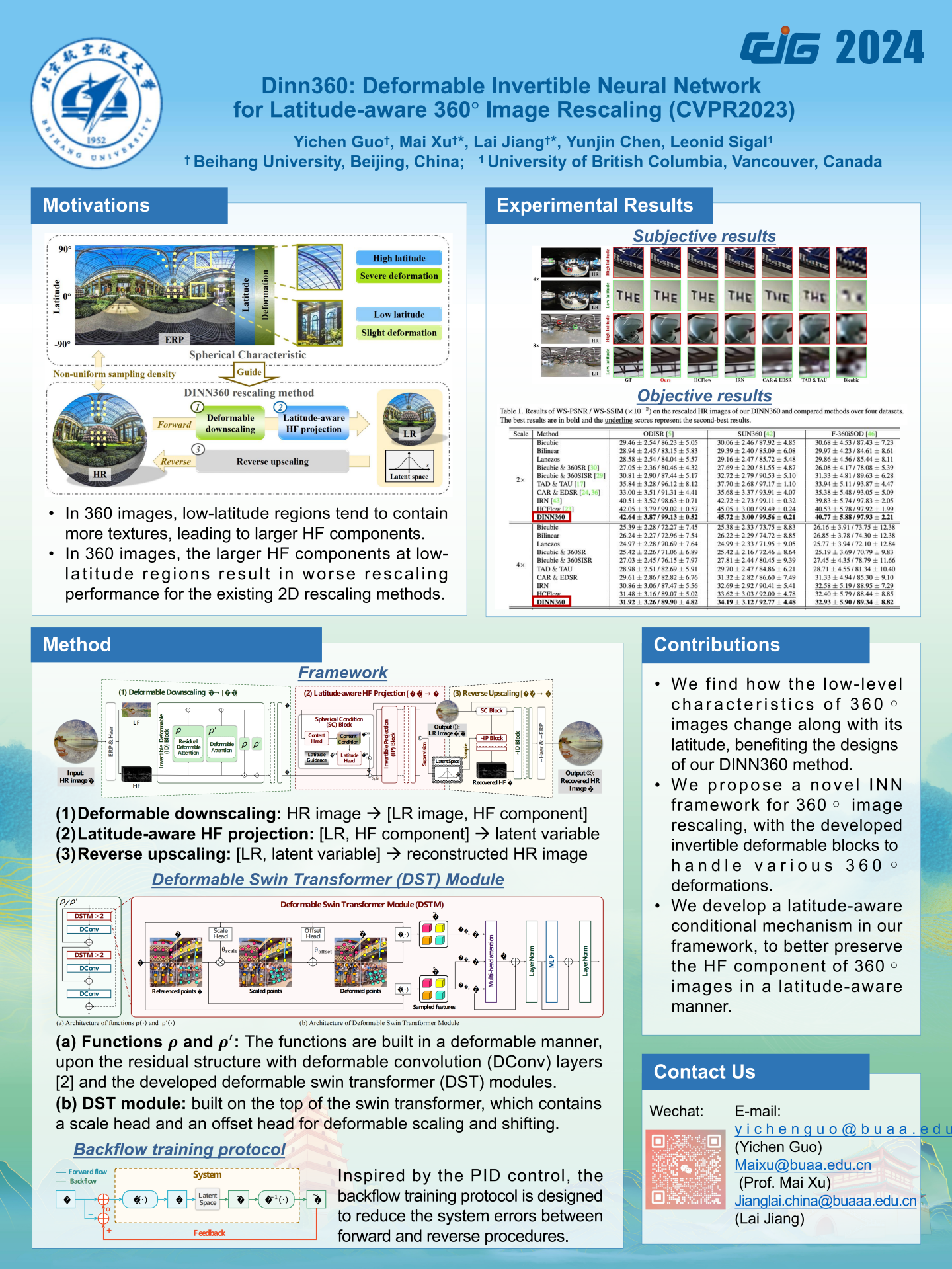 | P108 | DINN360: Deformable Invertible Neural Network for Latitude-aware 360◦ Image Rescaling | 郭苡辰,徐迈,蒋铼,Leonid Sigal,陈韵锦 | CVPR | 查看 |