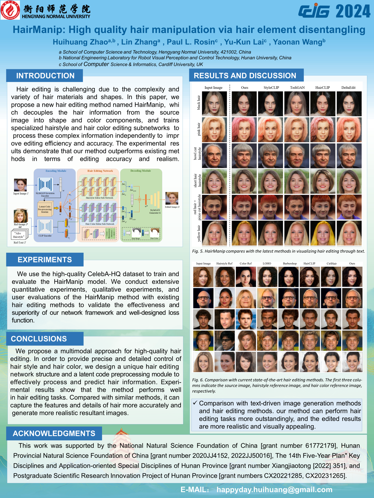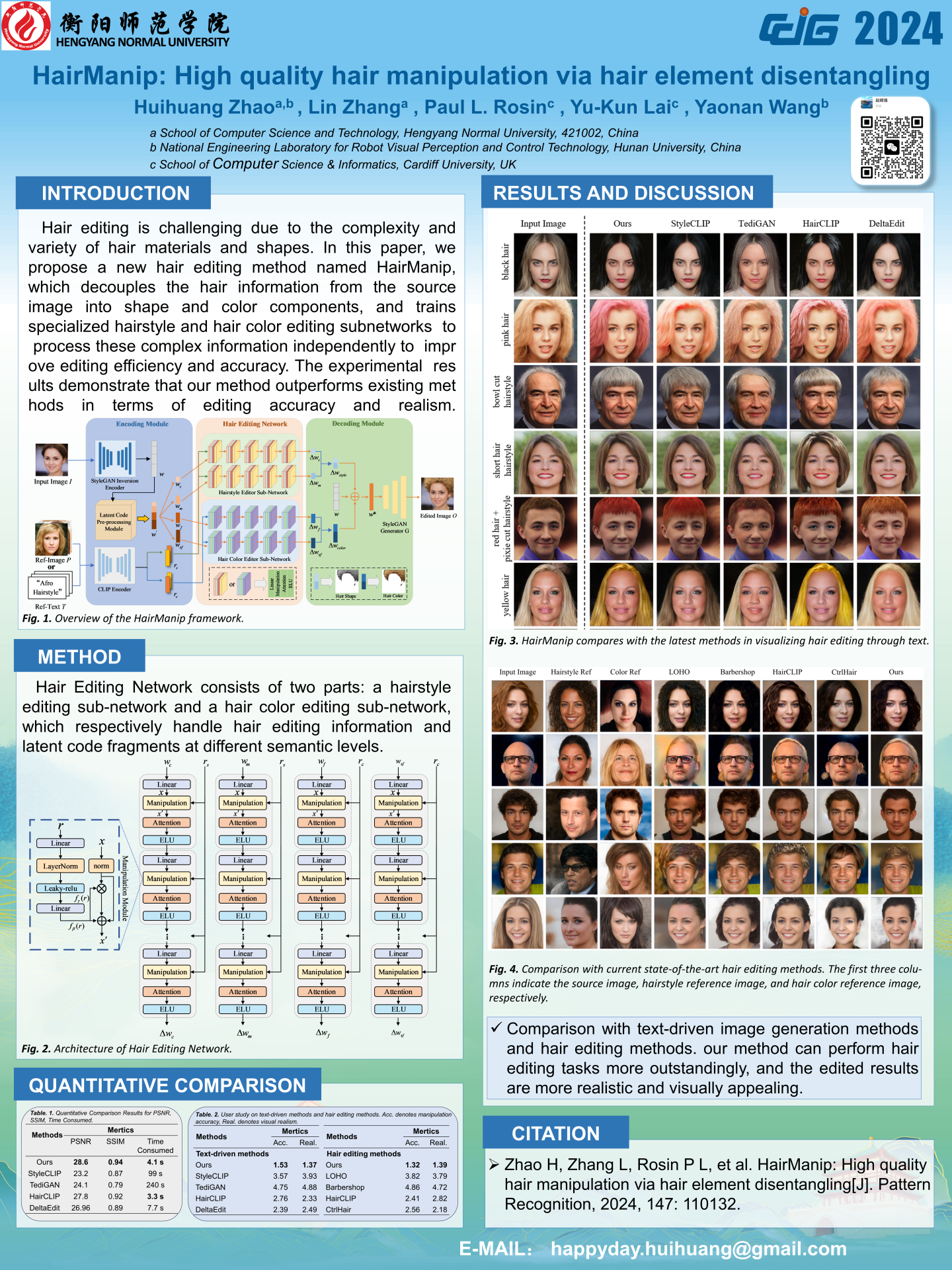 | P055 | HairManip: High quality hair manipulation via hair element disentangling | 赵辉煌,张林,Paul L.Rosin,来煜坤,王耀南 | Pattern Recognition | 查看 |