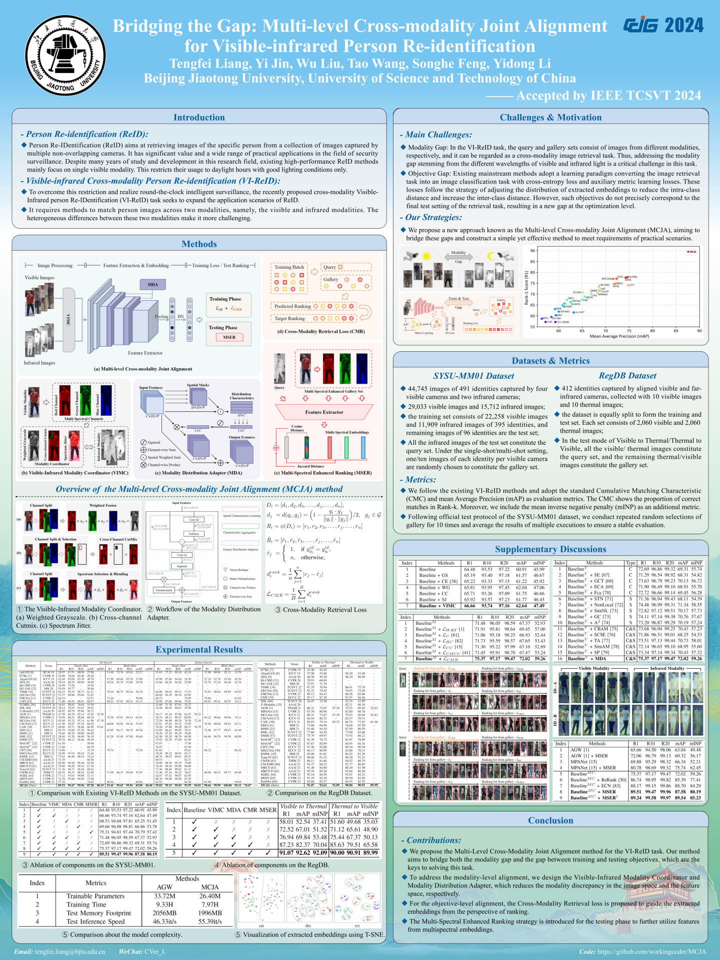 | P019 | Bridging the Gap: Multi-level Cross-modality Joint Alignment for Visible-infrared Person Re-identification | 梁腾飞、金一、刘武、王涛、冯松鹤、李浥东 | IEEE TCSVT | 查看 |