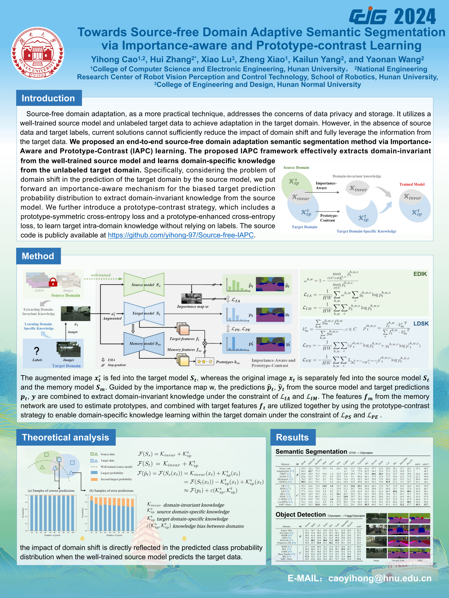 | P021 | Towards Source-free Domain Adaptive Semantic Segmentation via Importance-aware and Prototype-contrast Learning | 曹意宏、张辉、卢笑、肖正、杨恺伦、王耀南 | IEEE TIV | 查看 |
