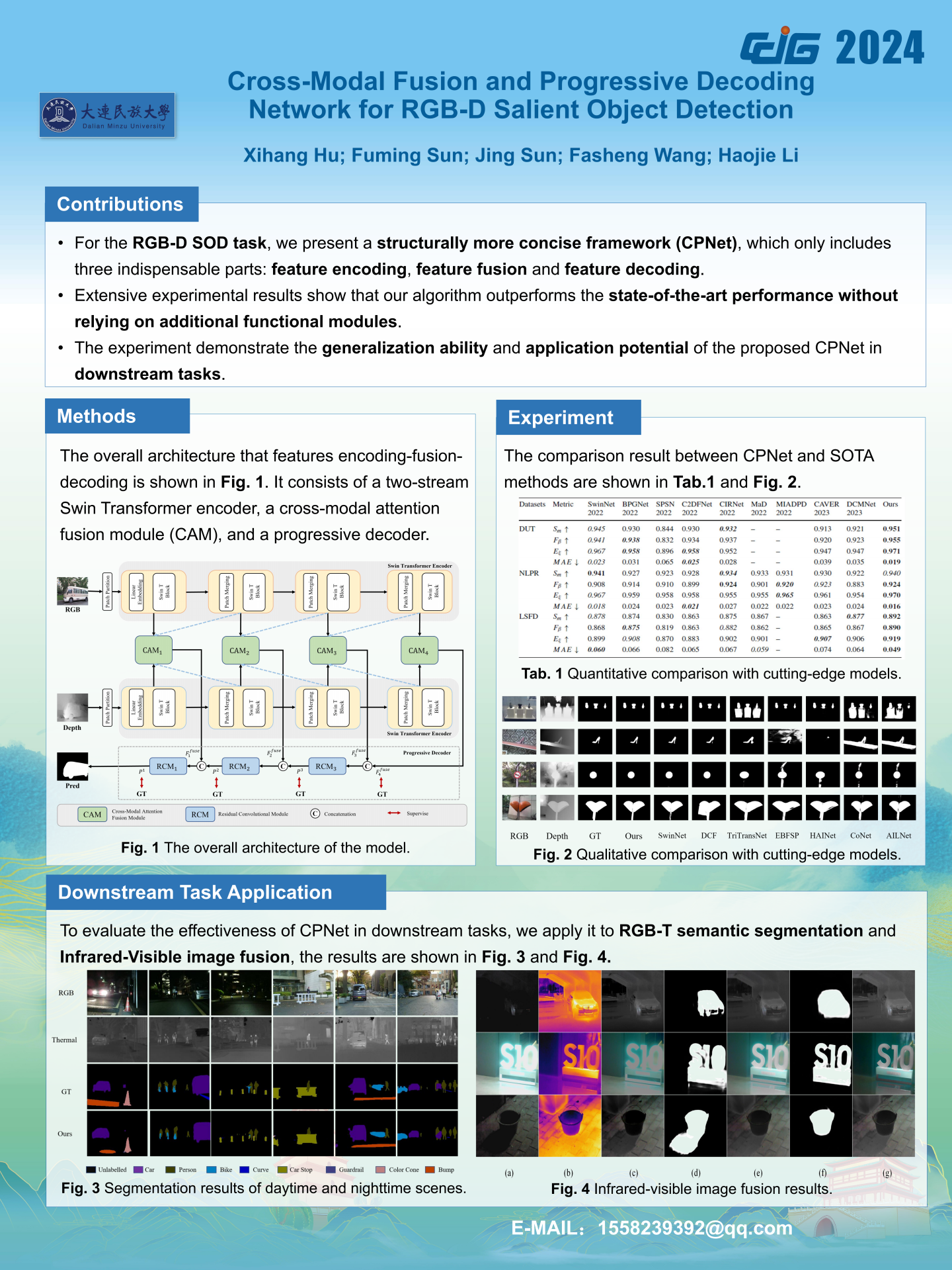 | P022 | Cross-Modal Fusion and Progressive Decoding Network for RGB-D Salient Object Detection | 胡锡航、孙福明、孙静、王法胜、李豪杰 | IJCV | 查看 |