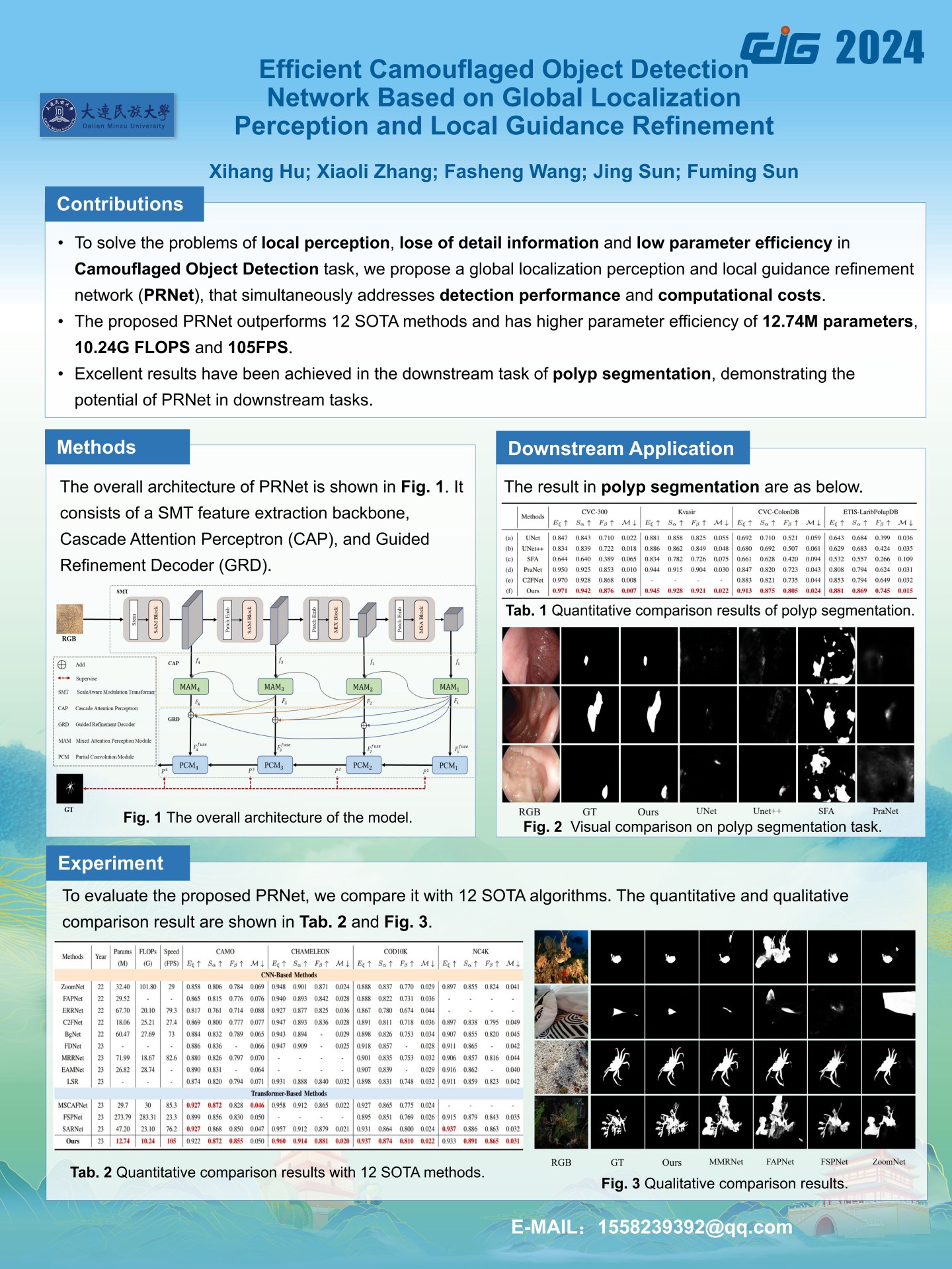 | P023 | Efficient Camouflaged Object Detection Network Based on Global Localization Perception and Local Guidance Refinement | 胡锡航、张小利、王法胜、孙静、孙福明 | IEEE TCSVT | 查看 |