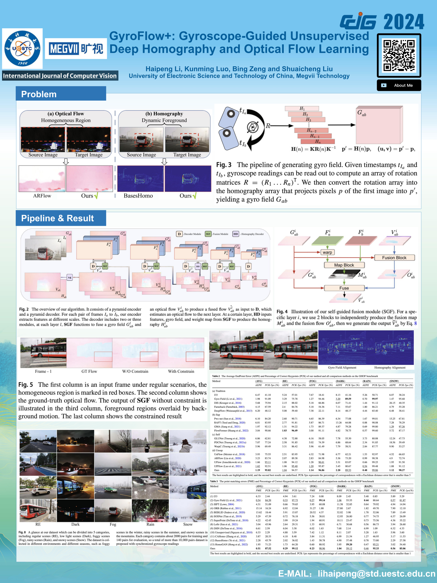 | P024 | GyroFlow+: Gyroscope-Guided Unsupervised Deep Homography and Optical Flow Learning | 李海鹏、罗堃铭、曾兵、刘帅成 | IJCV | 查看 |