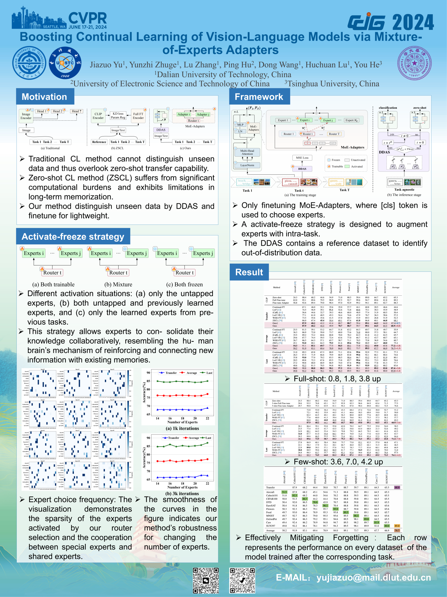 | P028 | Boosting Continual Learning of Vision-Language Models via Mixture- of-Experts Adapters | 于佳左、诸葛云志、张璐、胡平、王栋、卢湖川、何友 | CVPR | 查看 |