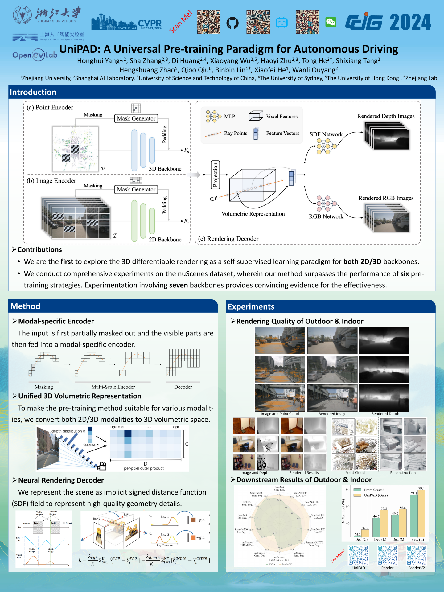 | P036 | UniPAD: A Universal Pre-training Paradigm for Autonomous Driving | 杨鸿辉、张莎、黄迪、吴虓杨、朱皓怡、贺通、唐诗翔、赵恒爽、邱奇波、林彬彬、何晓飞、欧阳万里 | CVPR | 查看 |