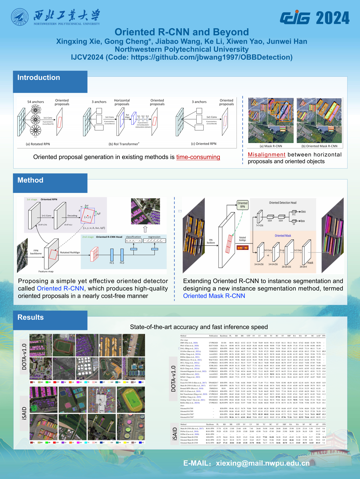 | P037 | Oriented R-CNN and Beyond | 谢星星、程塨、王家宝、李科、姚西文、韩军伟 | IJCV | 查看 |
