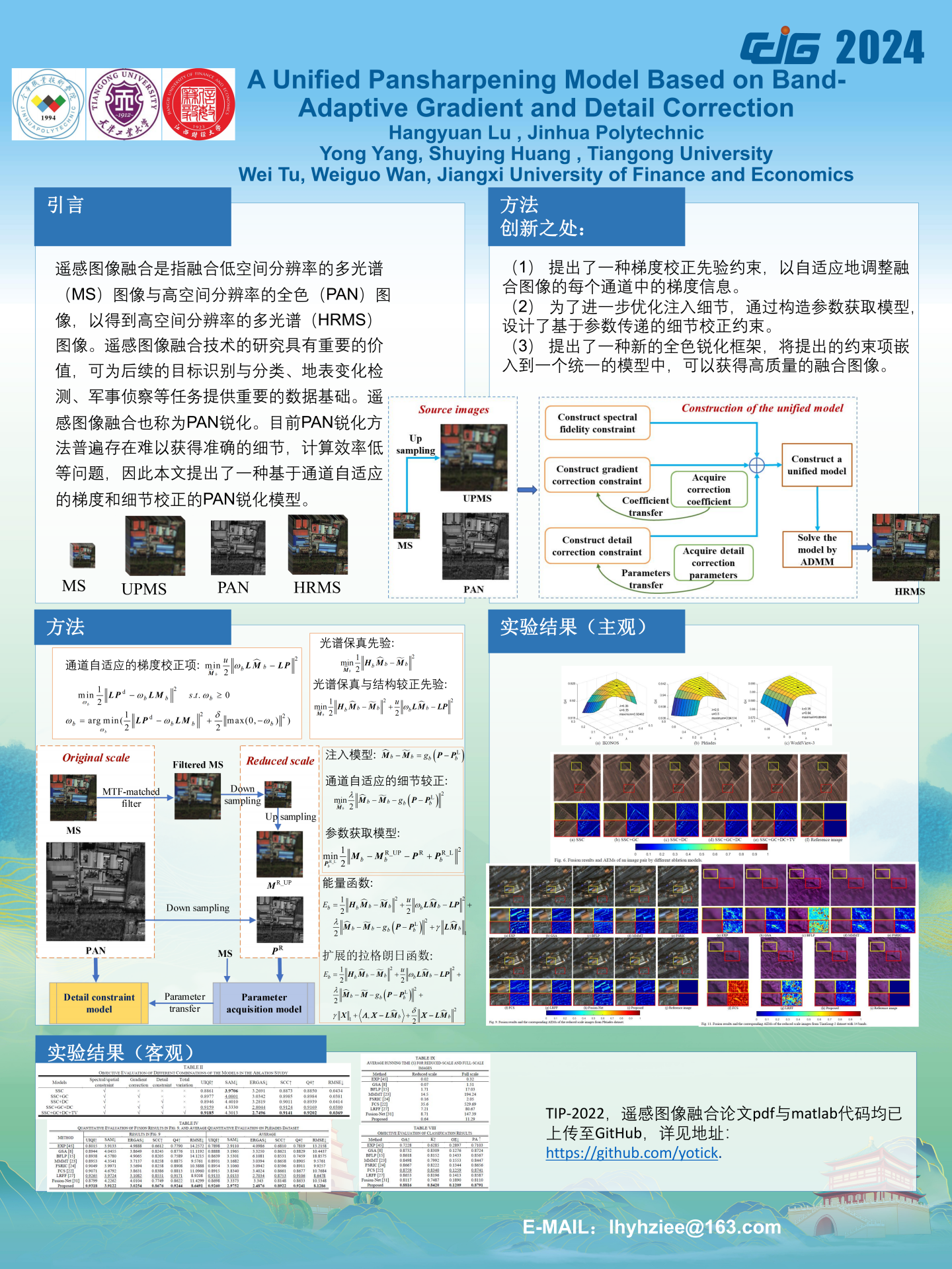 | P038 | A Unified Pansharpening Model Based on Band-Adaptive Gradient and Detail Correction | 卢航远,杨勇,黄淑英,涂伟,万伟国 | IEEE TIP | 查看 |