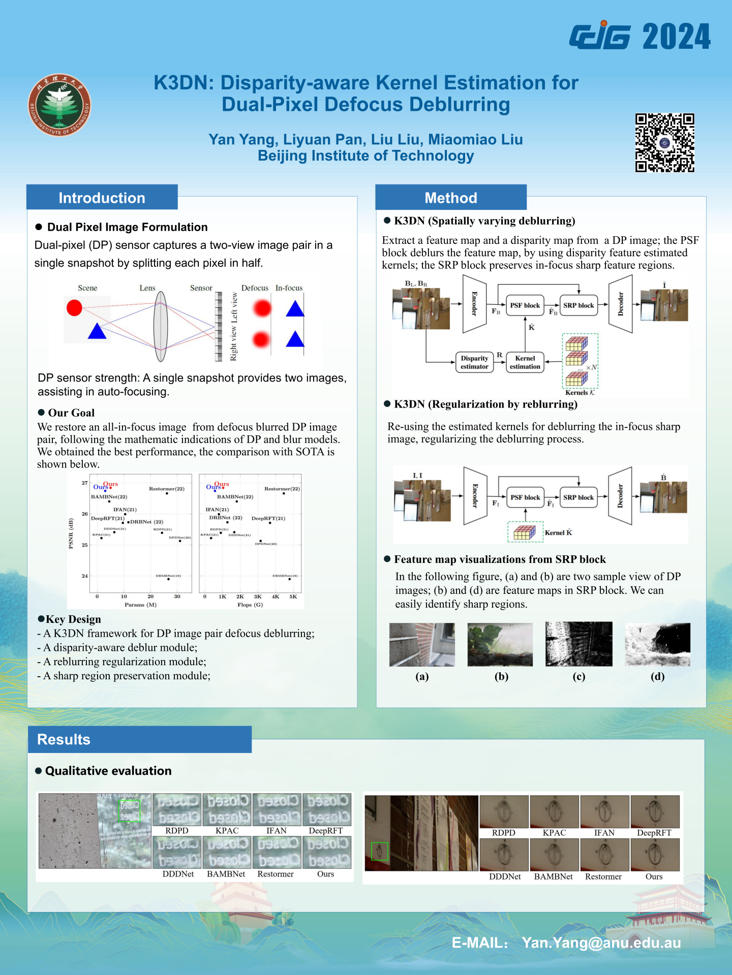 | P039 | K3DN: Disparity-aware Kernel Estimation for Dual-Pixel Defocus Deblurring | 杨焱、潘利源、刘流、Miaomiao Liu | CVPR | 查看 |