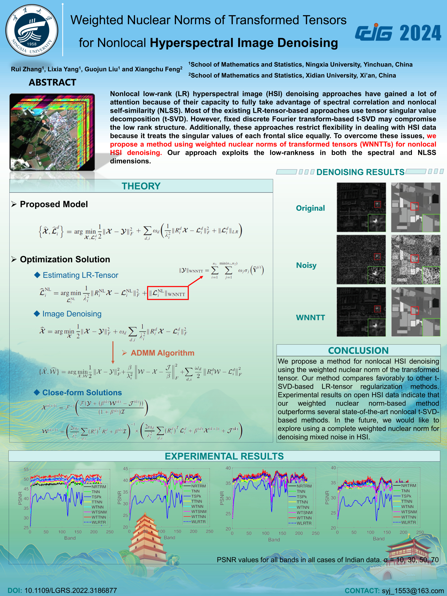 | P041 | Weighted Nuclear Norms of Transformed Tensors for Nonlocal Hyperspectral Image Denoising | 张瑞、杨丽霞、刘国军、冯象初 | IEEE GRSL | 查看 |