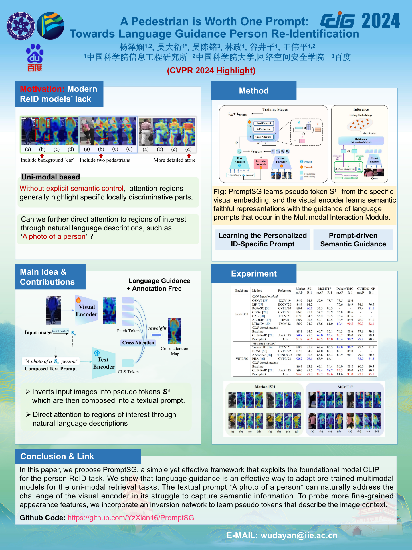 | P042 | A Pedestrian is Worth One Prompt: Towards Language Guidance Person Re-Identification | 杨泽娴、吴大衍、吴陈铭、林政、谷井子、王伟平 | CVPR | 查看 |