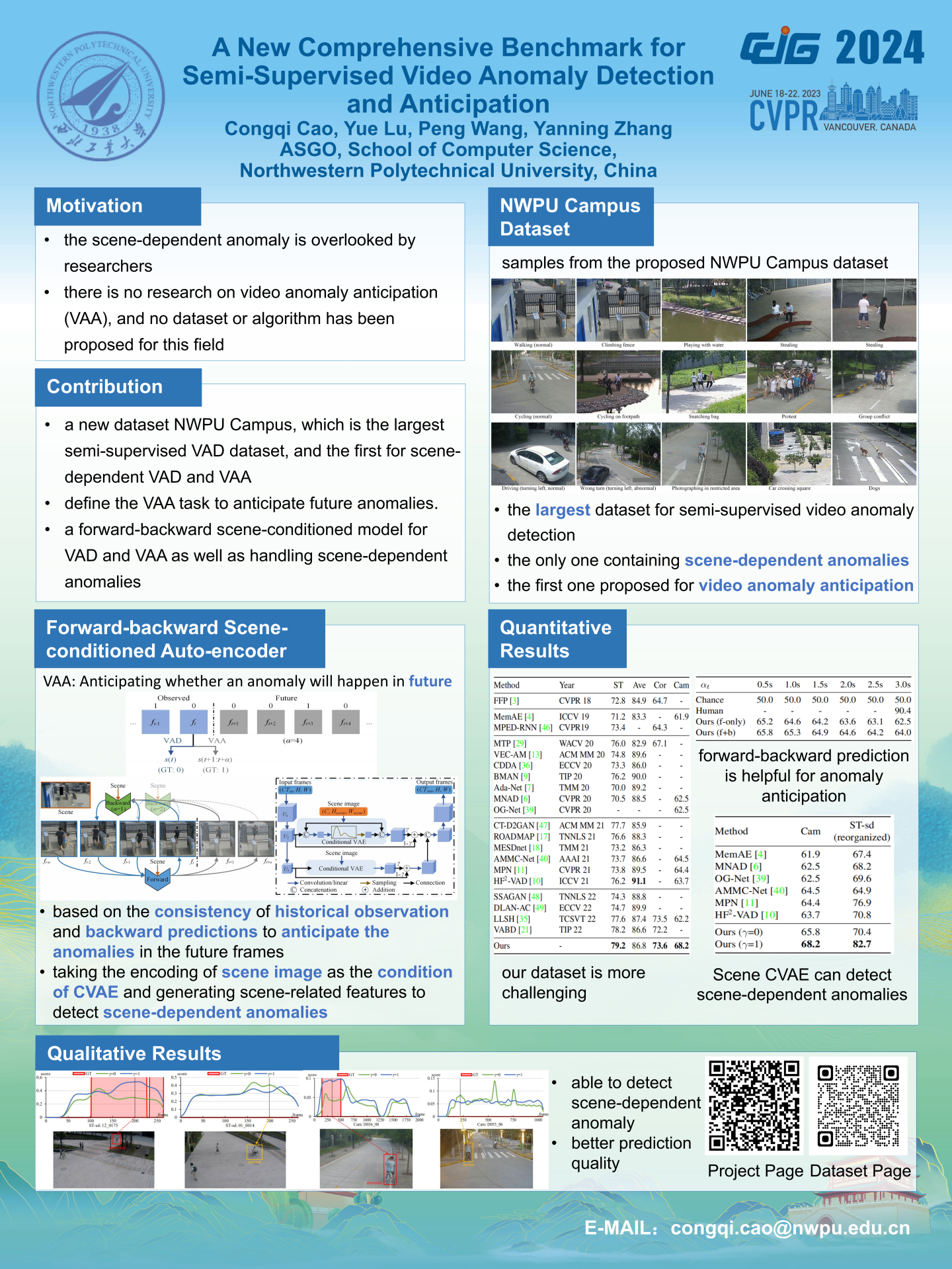 | P047 | A New Comprehensive Benchmark for Semi-supervised Video Anomaly Detection and Anticipation | 曹聪琦、路悦、王鹏、张艳宁 | CVPR | 查看 |