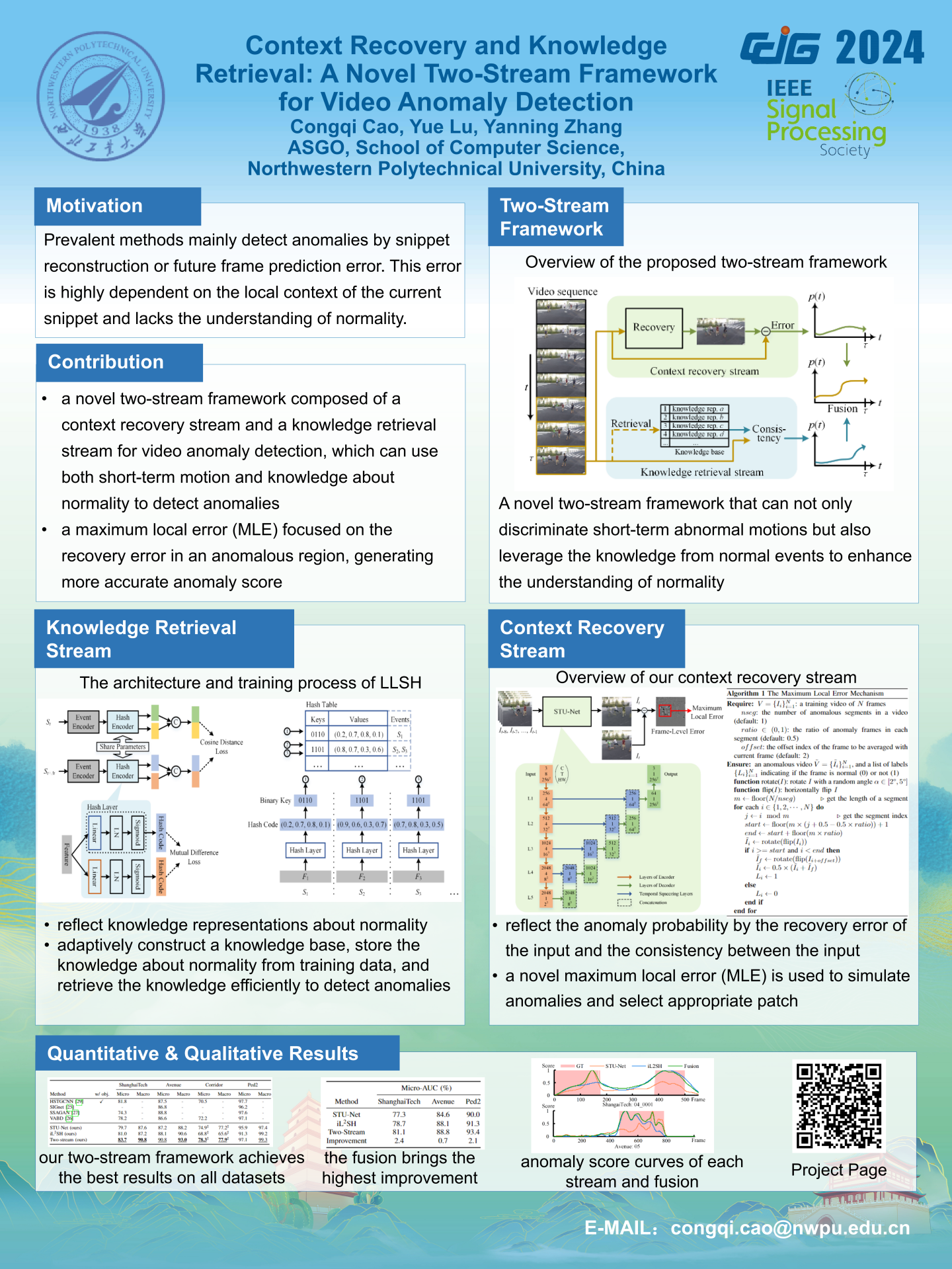 | P048 | Context Recovery and Knowledge Retrieval: A Novel Two-Stream Framework for Video Anomaly Detection | 曹聪琦、路悦、张艳宁 | IEEE TIP | 查看 |