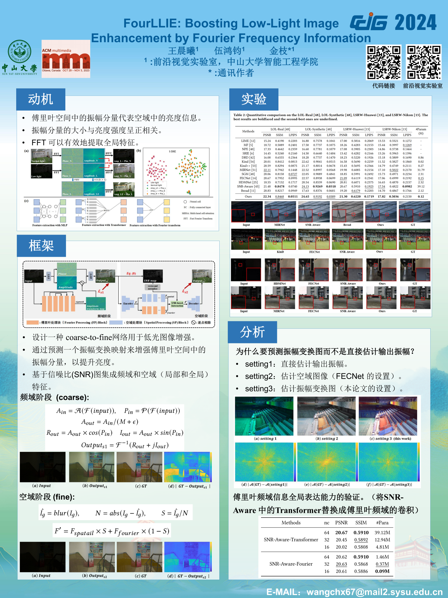 | P054 | FourLLIE: Boosting Low-Light Image Enhancement by Fourier Frequency Information | 王晨曦、伍鸿钧、金枝 | ACMM | 查看 |