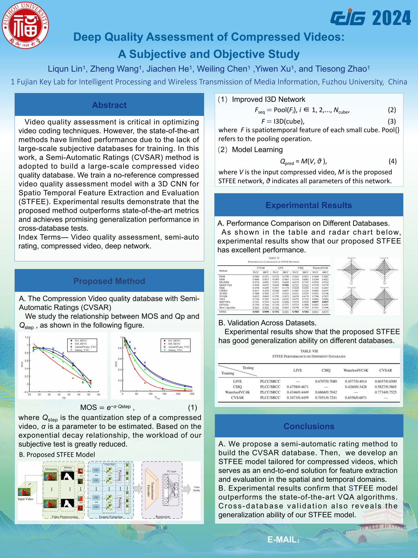 | P056 | Deep Quality Assessment of Compressed Videos: A Subjective and Objective Study | 林丽群、王郑、何嘉晨、陈炜玲、徐艺文,Yiwen Xu1, and Tiesong Zhao | IEEE TCSVT | 查看 |