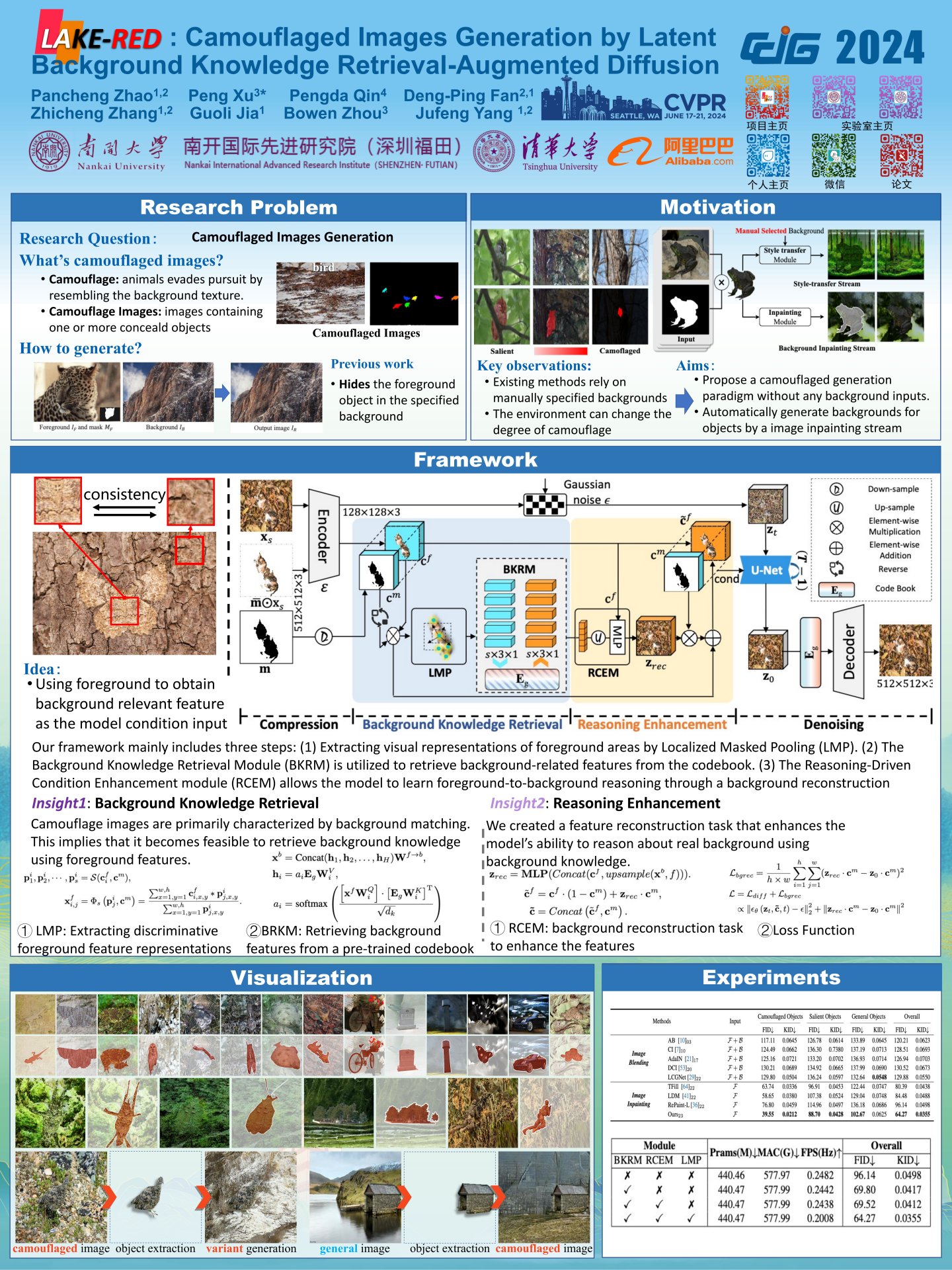 | P057 | LAKE-RED: Camouflaged Images Generation by Latent Background Knowledge Retrieval-Augmented Diffusion | 赵攀诚、徐鹏、秦鹏达、范登平、张知诚、贾国力、周伯文、杨巨峰 | CVPR | 查看 |