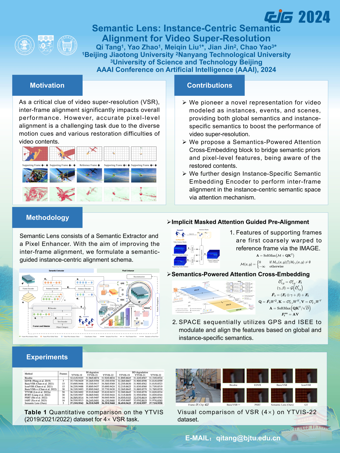 | P058 | Semantic Lens: Instance-Centric Semantic Alignment for Video Super-Resolution | 唐麒、赵耀、刘美琴、金鉴、姚超 | AAAI | 查看 |