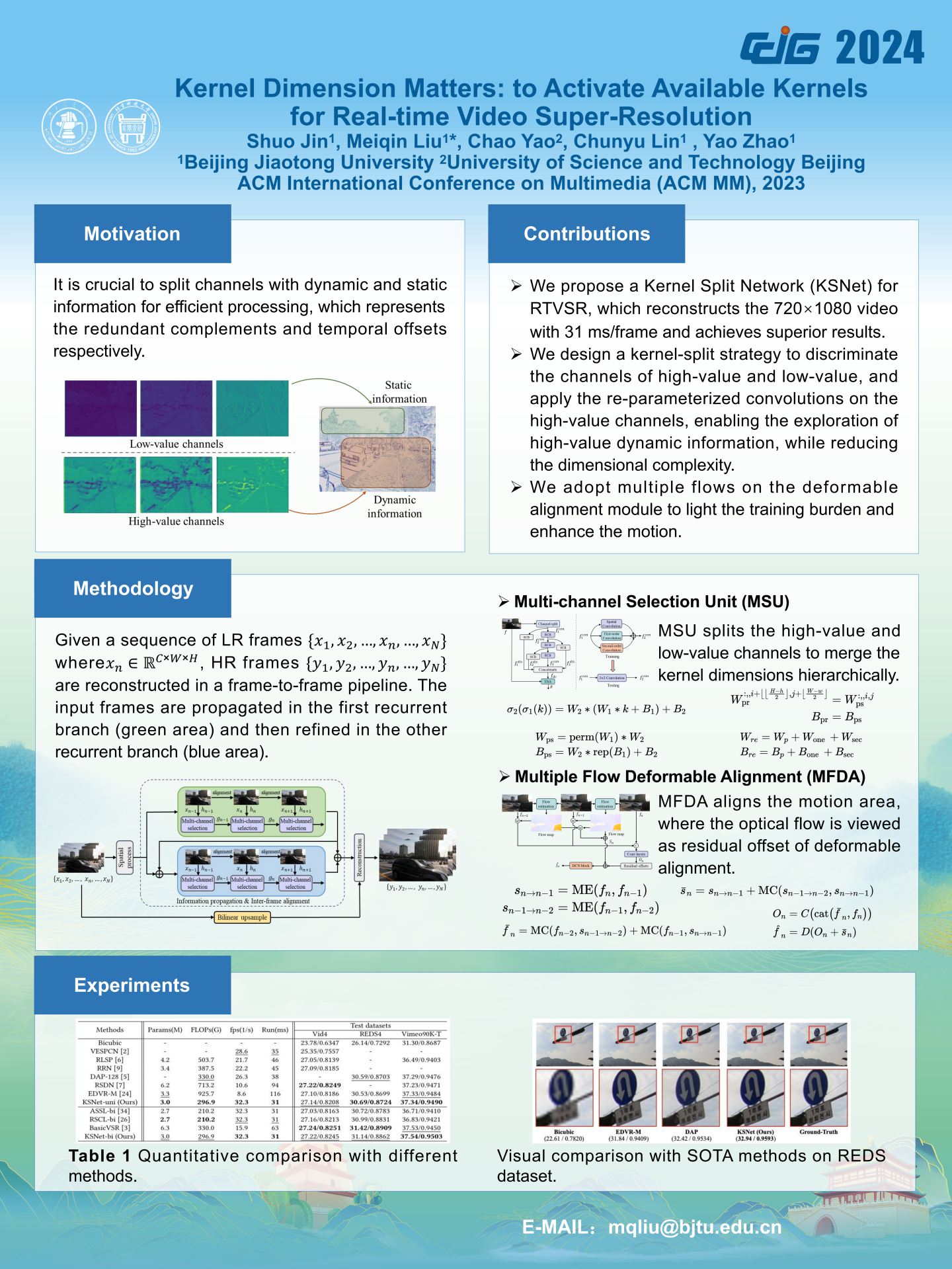 | P059 | Kernel Dimension Matters: to Activate Available Kernels for Real-time Video Super-Resolution | 金硕,刘美琴,姚超,林春雨,赵耀 | ACMM | 查看 |