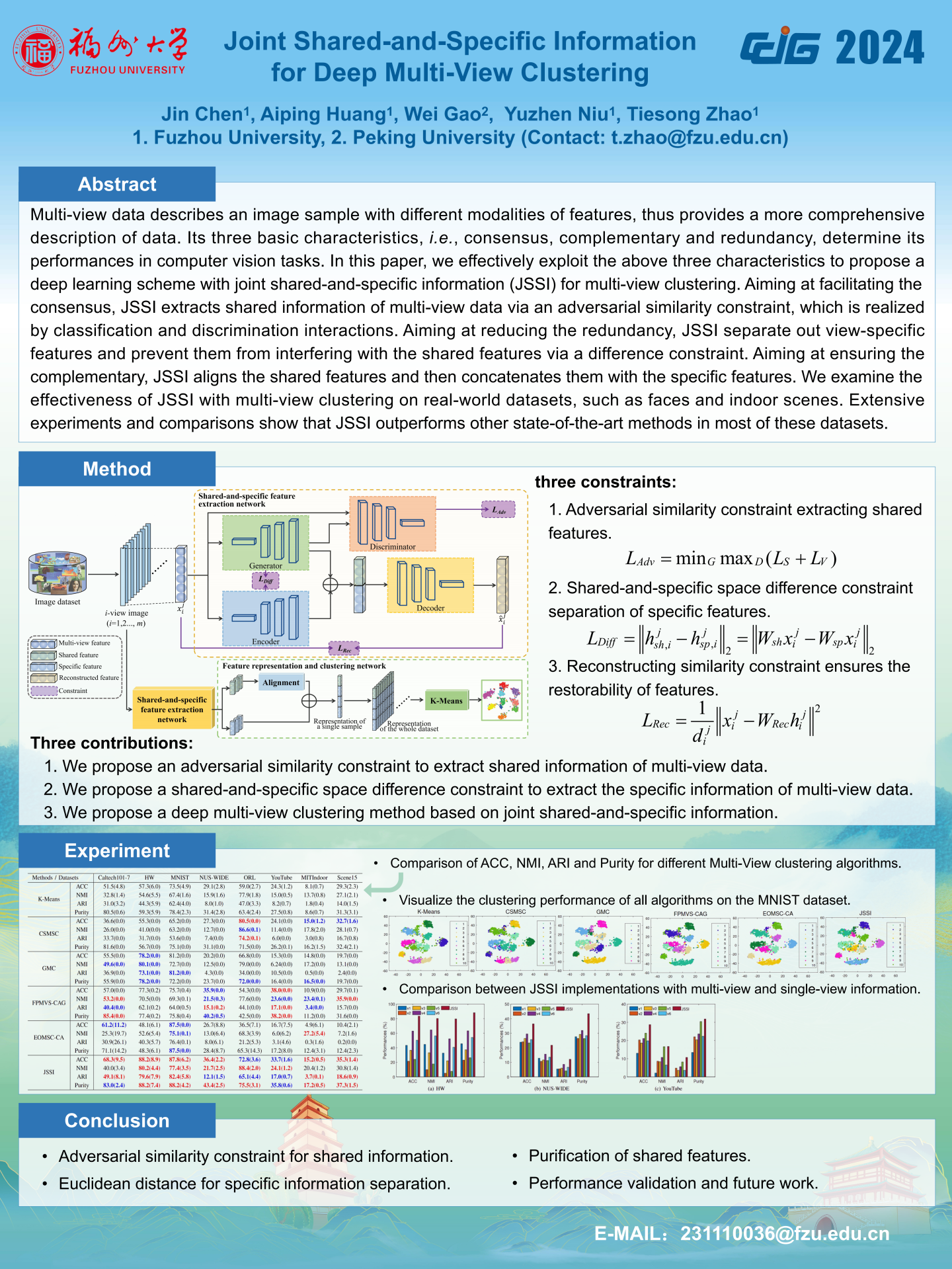 | P060 | Joint Shared-and-Specific Information for Deep Multi-View Clustering | 陈瑾、黄爱萍、高伟、牛玉贞、赵铁松 | IEEE TCSVT | 查看 |