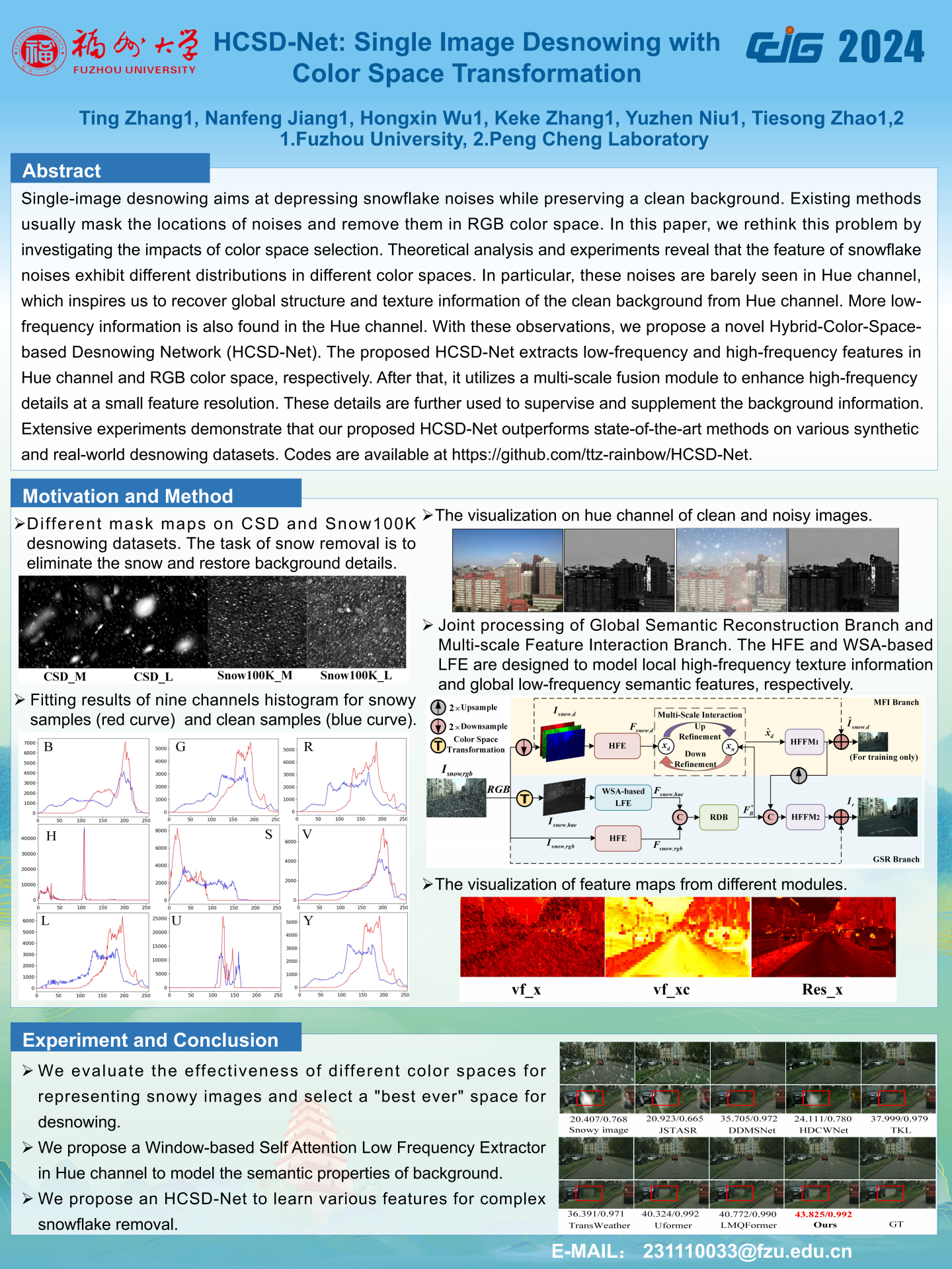 | P061 | HCSD-Net: Single Image Desnowing with Color Space Transformation | 张婷、江楠峰、吴洪鑫、张可可、牛玉贞、赵铁松 | ACMM | 查看 |