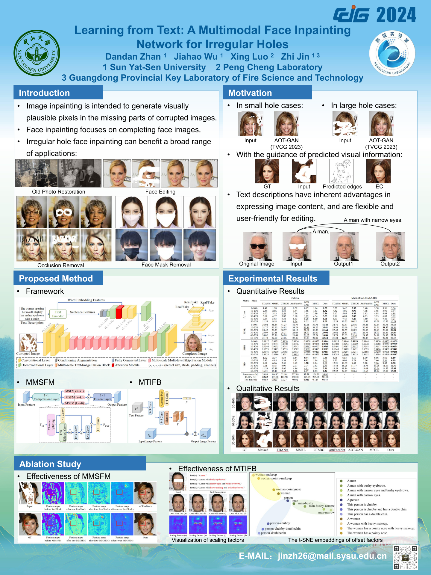 | P063 | Learning from Text: A Multimodal Face Inpainting Network for Irregular Holes | 詹丹丹、吴嘉豪、罗兴、金枝 | IEEE TCSVT | 查看 |