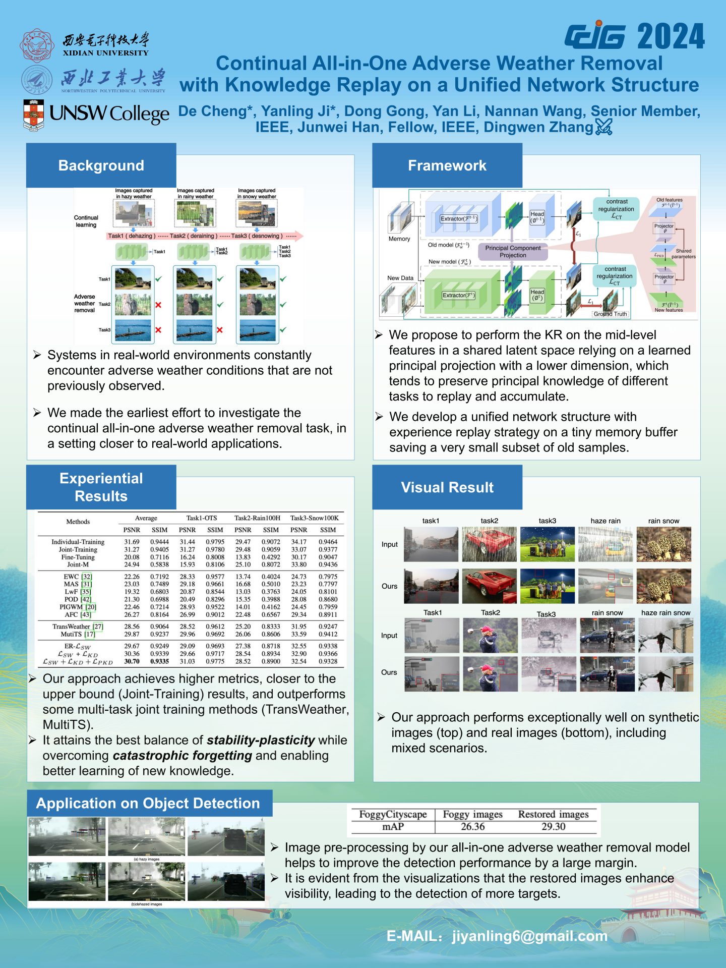 | P068 | Continual All-in-One Adverse Weather Removal with Knowledge Replay on a Unified Network Structure | 程徳、姬延岭、巩东、王楠楠、韩军伟、张鼎文 | IEEE TMM | 查看 |
