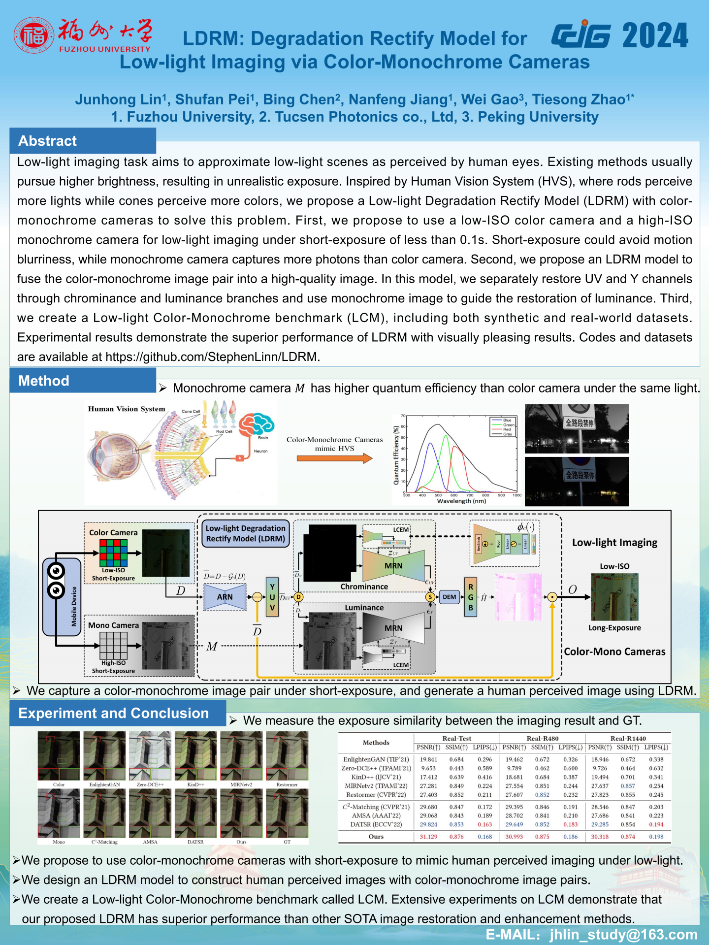 | P069 | LDRM: Degradation Rectify Model for Low-light Imaging via Color-Monochrome Cameras | 林俊鸿、裴舒凡、陈兵、江楠峰、高伟、赵铁松 | ACMM | 查看 |