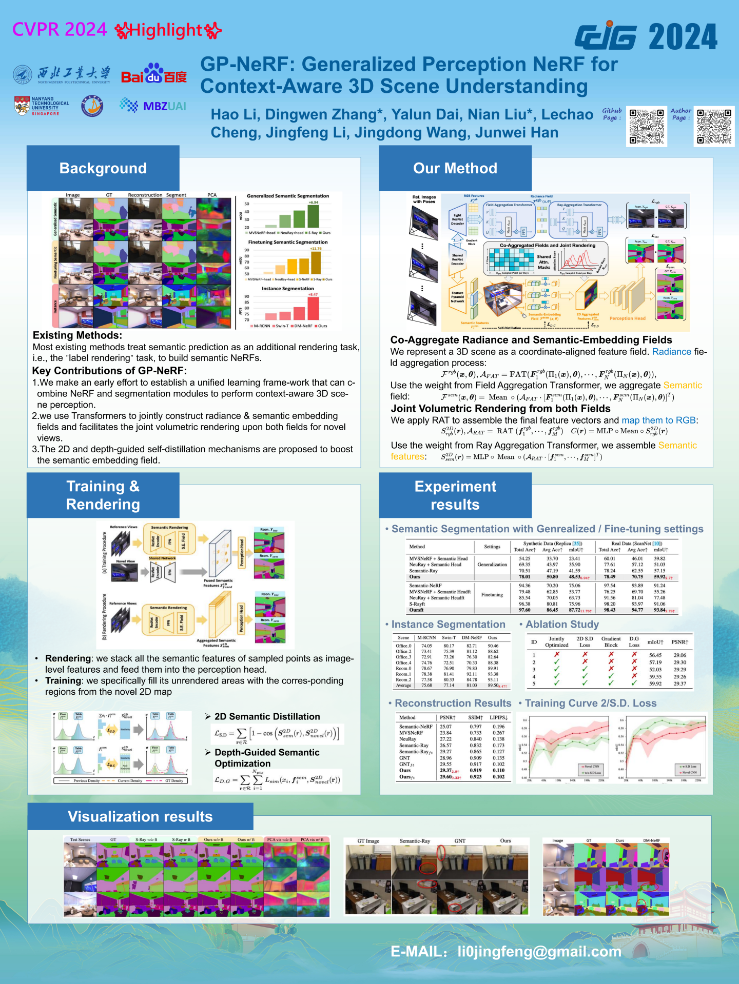 | P070 | GP-NeRF: Generalized Perception NeRF for Context-Aware 3D Scene Understanding | 李昊、张鼎文、戴雅伦、刘念、程乐超、李靖峰、王井东、韩军伟 | CVPR | 查看 |