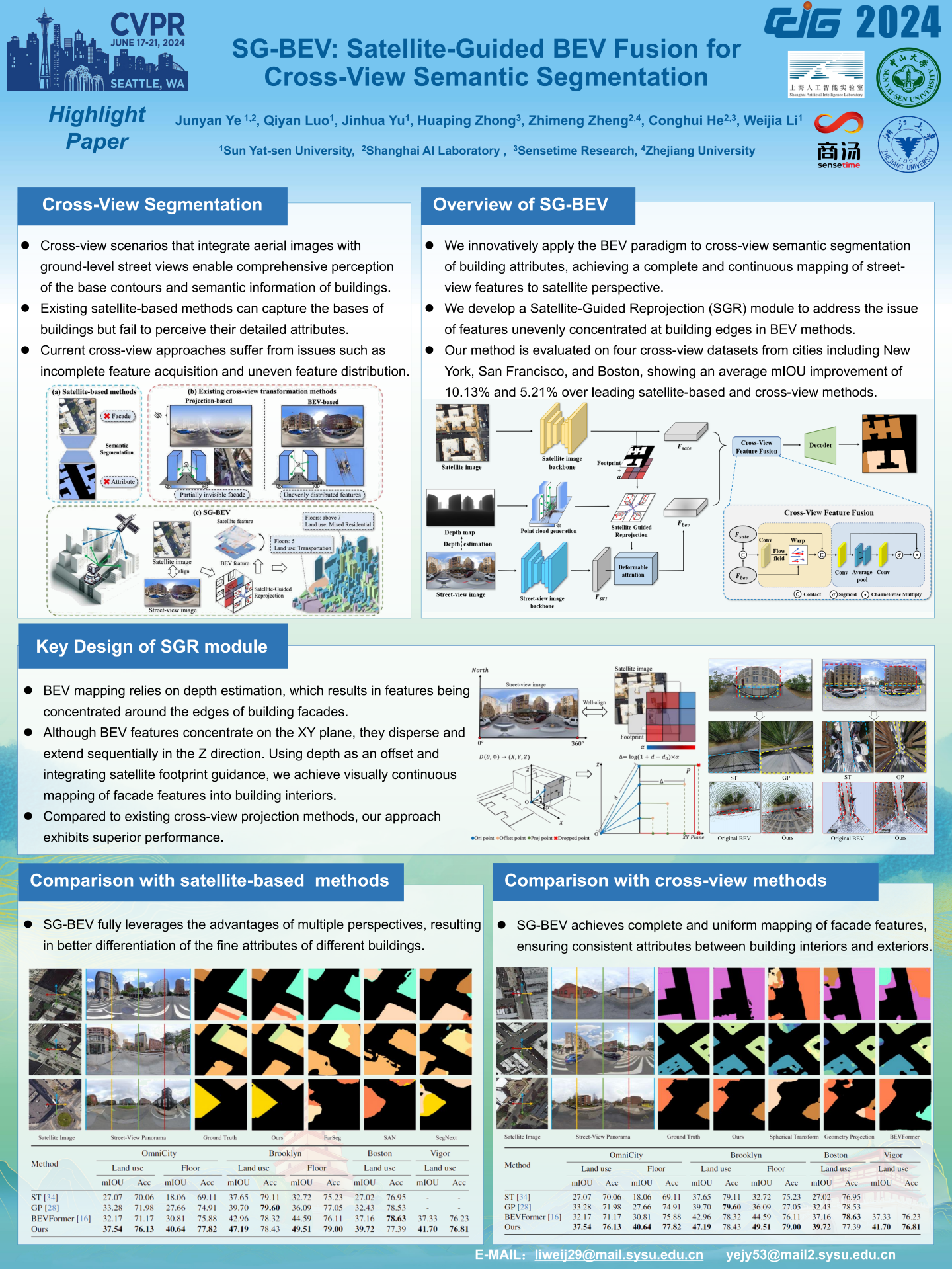 | P071 | SG-BEV: Satellite-Guided BEV Fusion for Cross-View Semantic Segmentation | 叶俊言、罗祺彦、于锦华、郑智萌、钟华平、何聪辉、李唯嘉 | CVPR | 查看 |