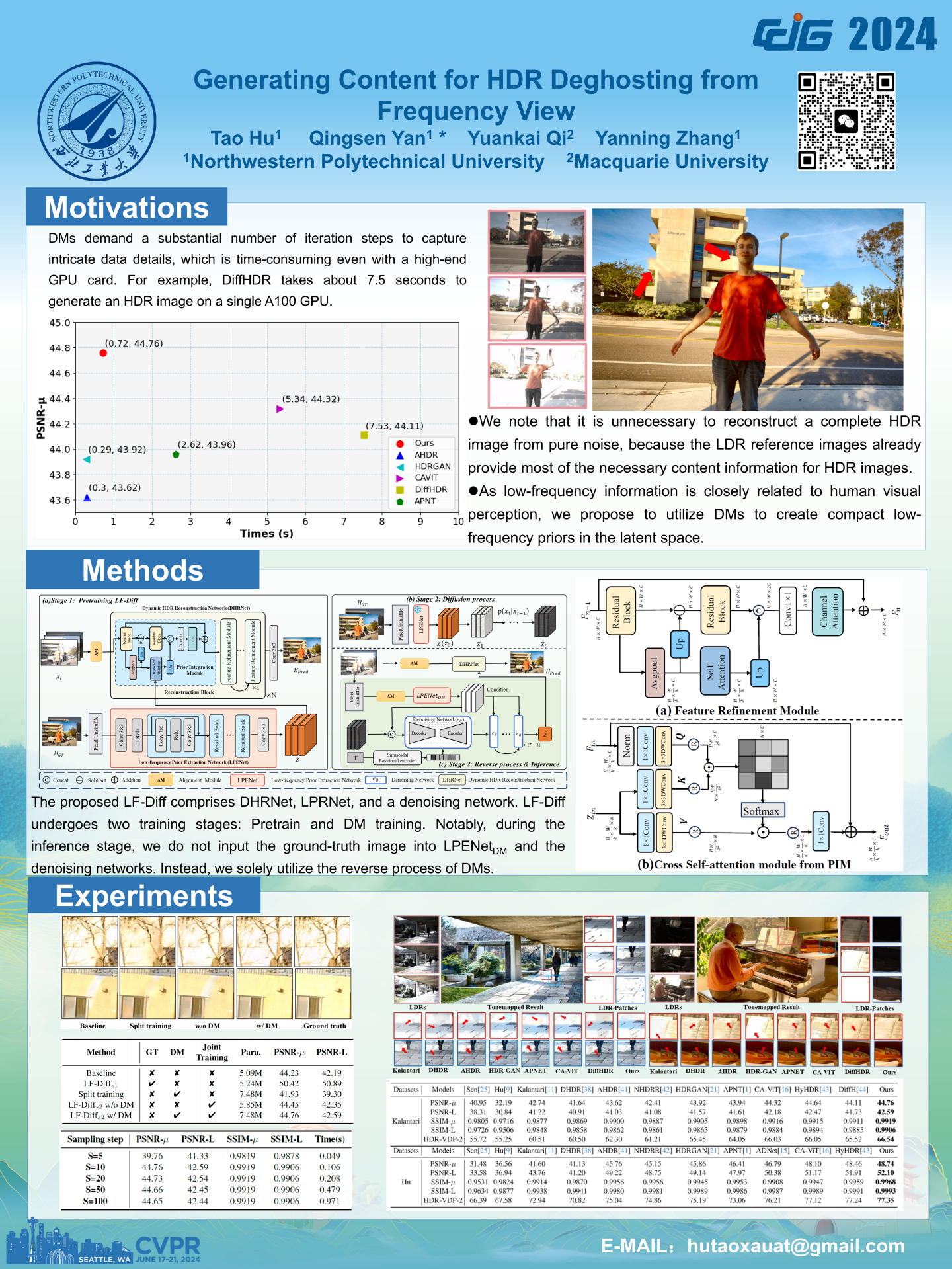 | P072 | Generating Content for HDR Deghosting from Frequency View | 胡涛、闫庆森、齐元凯、张艳宁 | CVPR | 查看 |