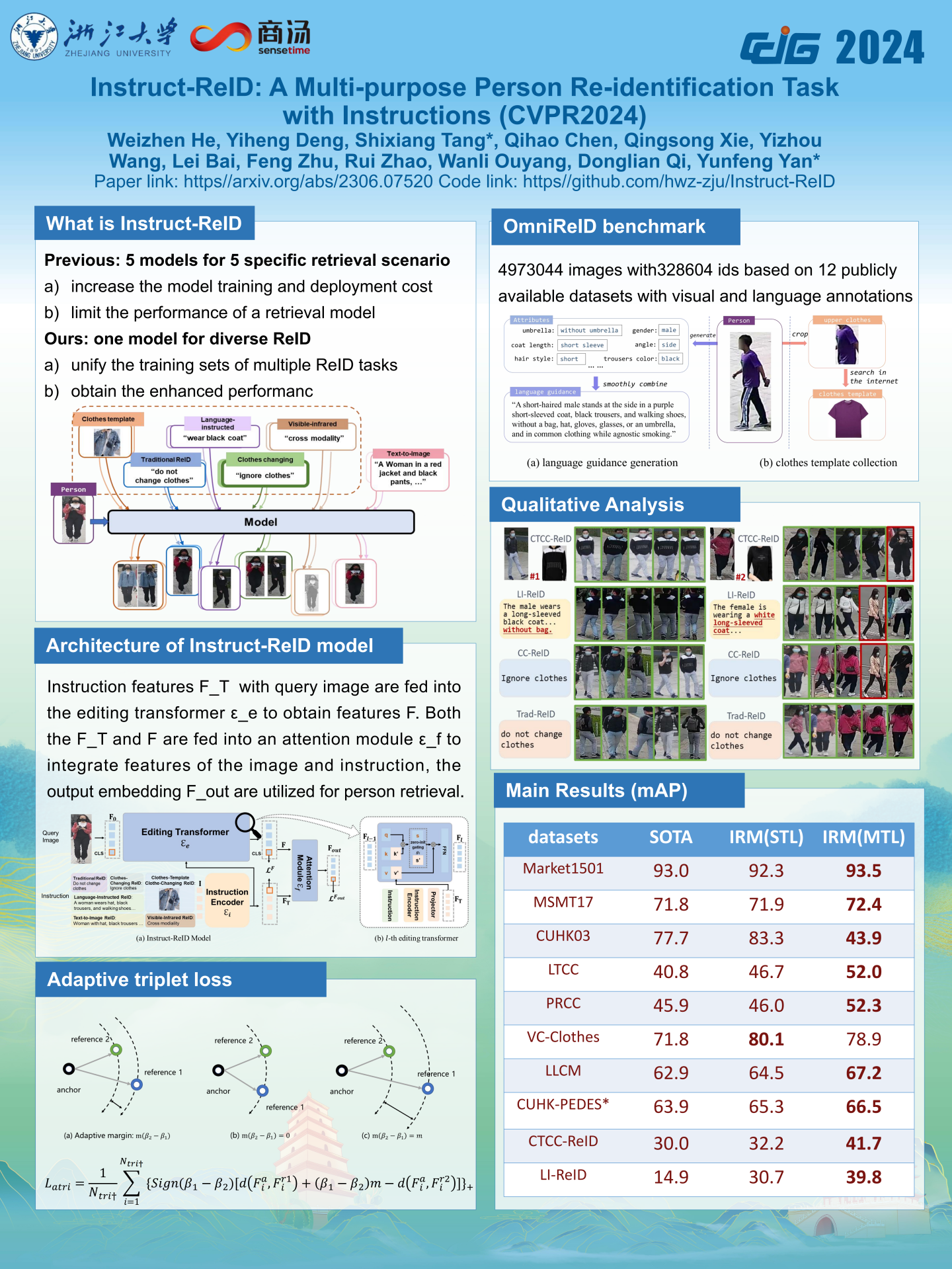 | P073 | Instruct-ReID: A Multi-purpose Person Re-identification Task with Instructions | 何威振,邓以恒,唐诗翔,陈祺浩,谢青松,王逸舟,白磊,朱烽,赵瑞,欧阳万里,齐冬莲,闫云凤 | CVPR | 查看 |