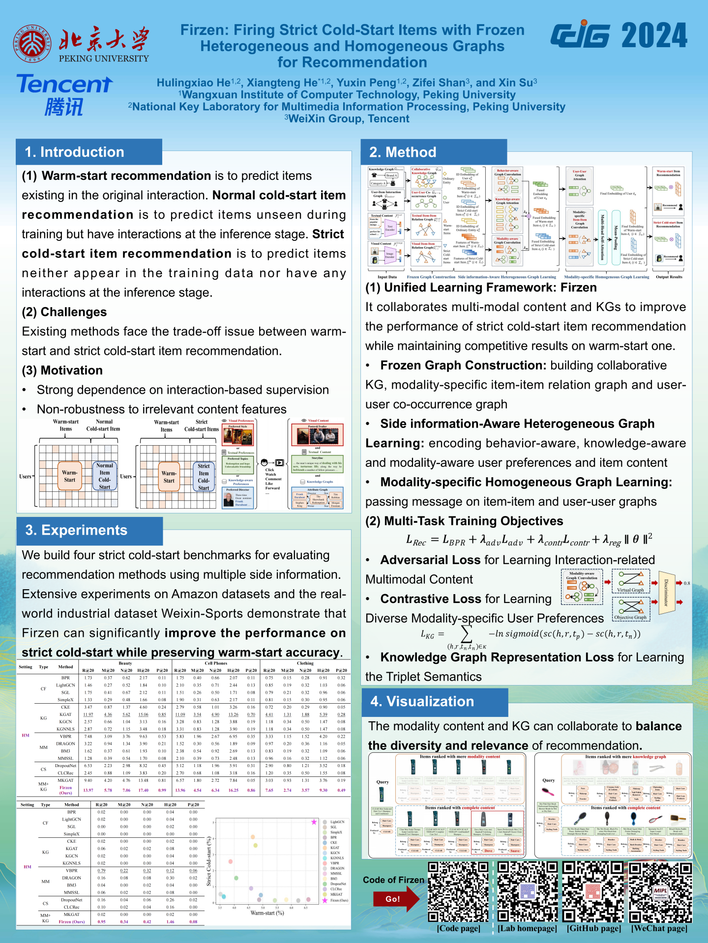 | P074 | Firzen: Firing Strict Cold-Start Items with Frozen Heterogeneous and Homogeneous Graphs for Recommendation | 何胡凌霄、何相腾、彭宇新、单子非、苏鑫 | ICDE | 查看 |