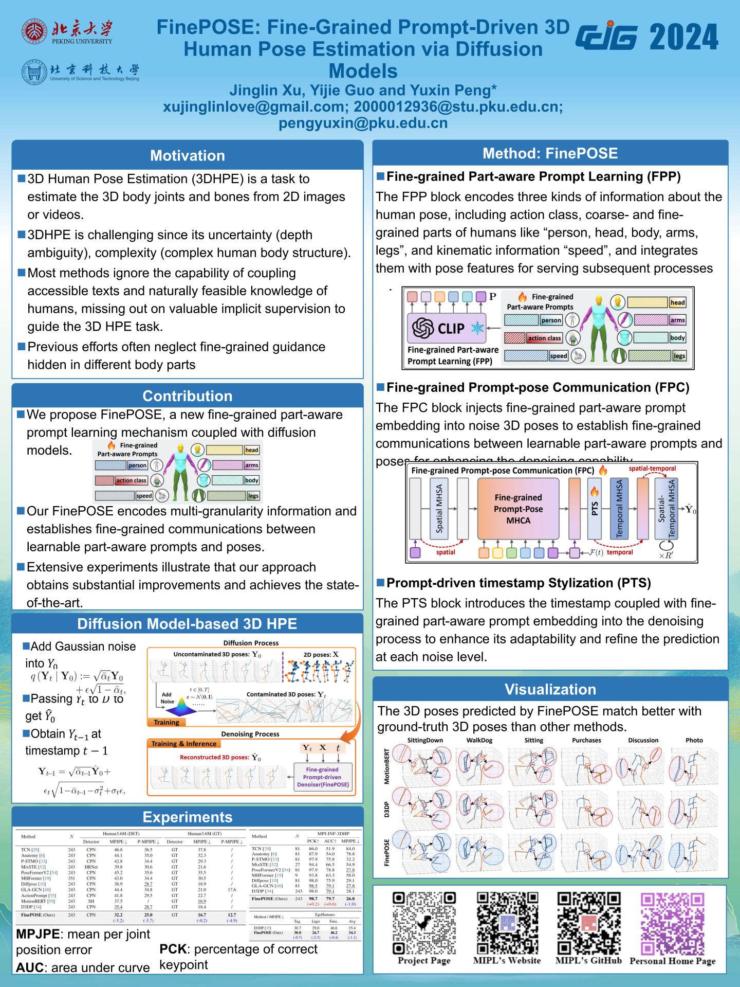 | P075 | FinePOSE: Fine-Grained Prompt-Driven 3D Human Pose Estimation via Diffusion Models | 徐婧林、郭奕杰、彭宇新 | CVPR | 查看 |