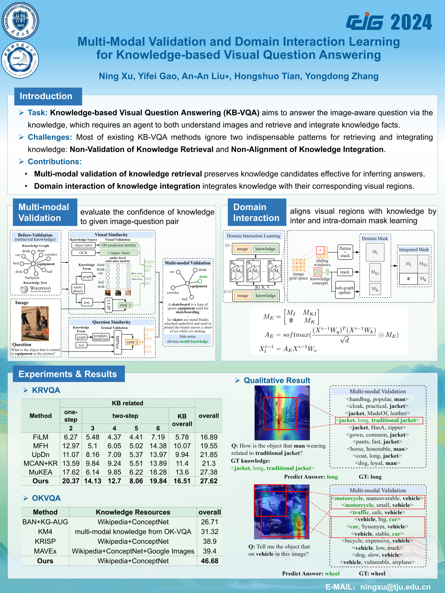 | P076 | Multi-Modal Validation and Domain Interaction Learning for Knowledge-based Visual Question Answering | 徐宁、高逸飞、刘安安、田宏硕、张勇东 | TKDE | 查看 |