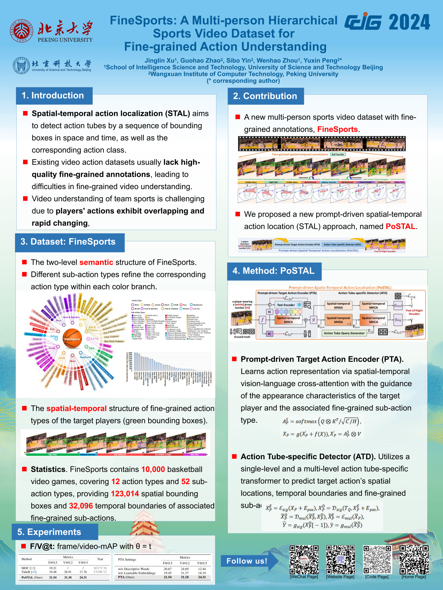 | P077 | FineSports: A Multi-person Hierarchical Sports Video Dataset for Fine-grained Action Understanding | 徐婧林、赵国豪、尹思博、周汶昊、彭宇新 | CVPR | 查看 |