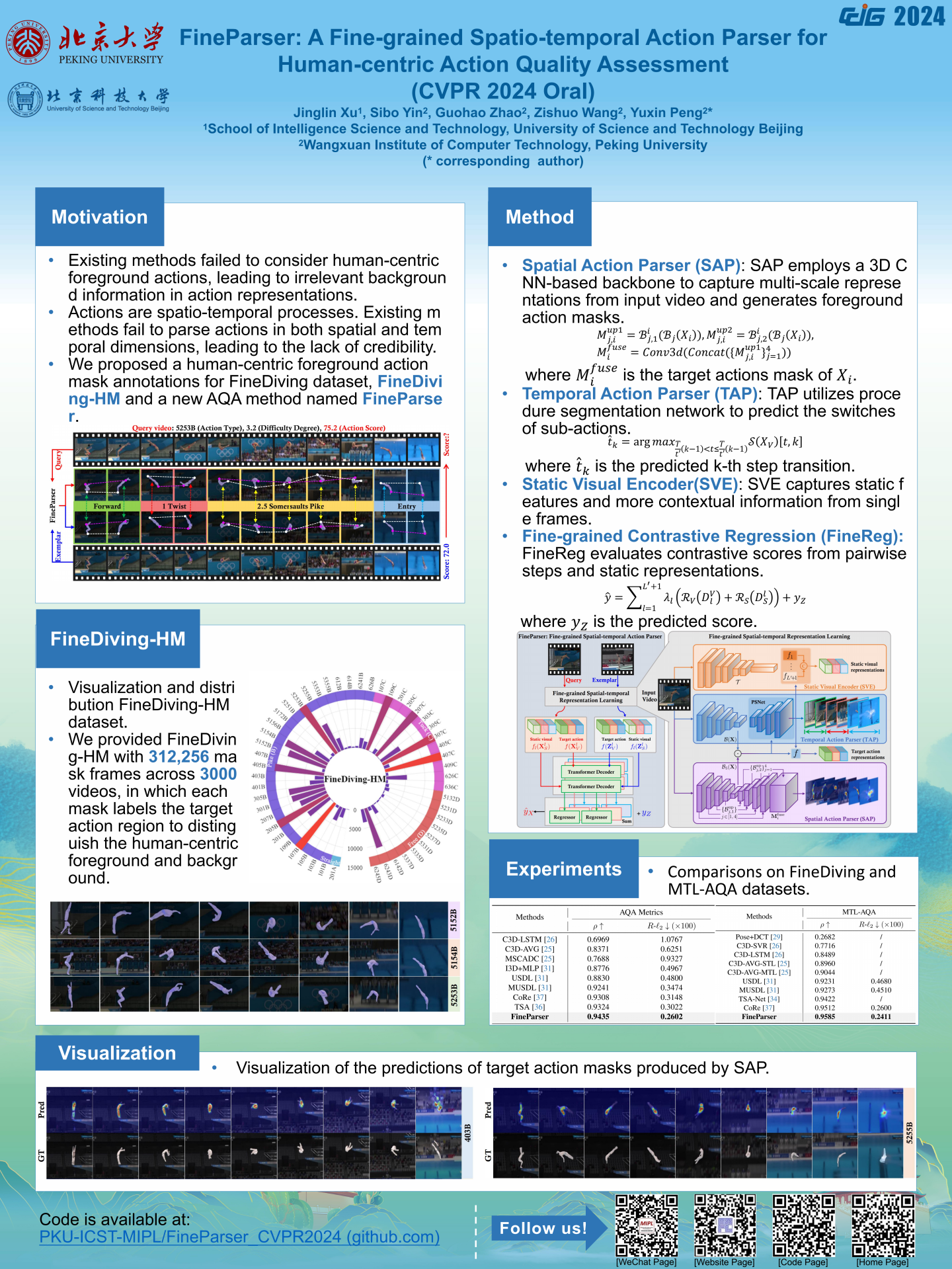 | P078 | FineParser: A Fine-grained Spatio-temporal Action Parser for Human-centric Action Quality Assessment | 徐婧林、尹思博、赵国豪、王梓烁、彭宇新 | CVPR | 查看 |