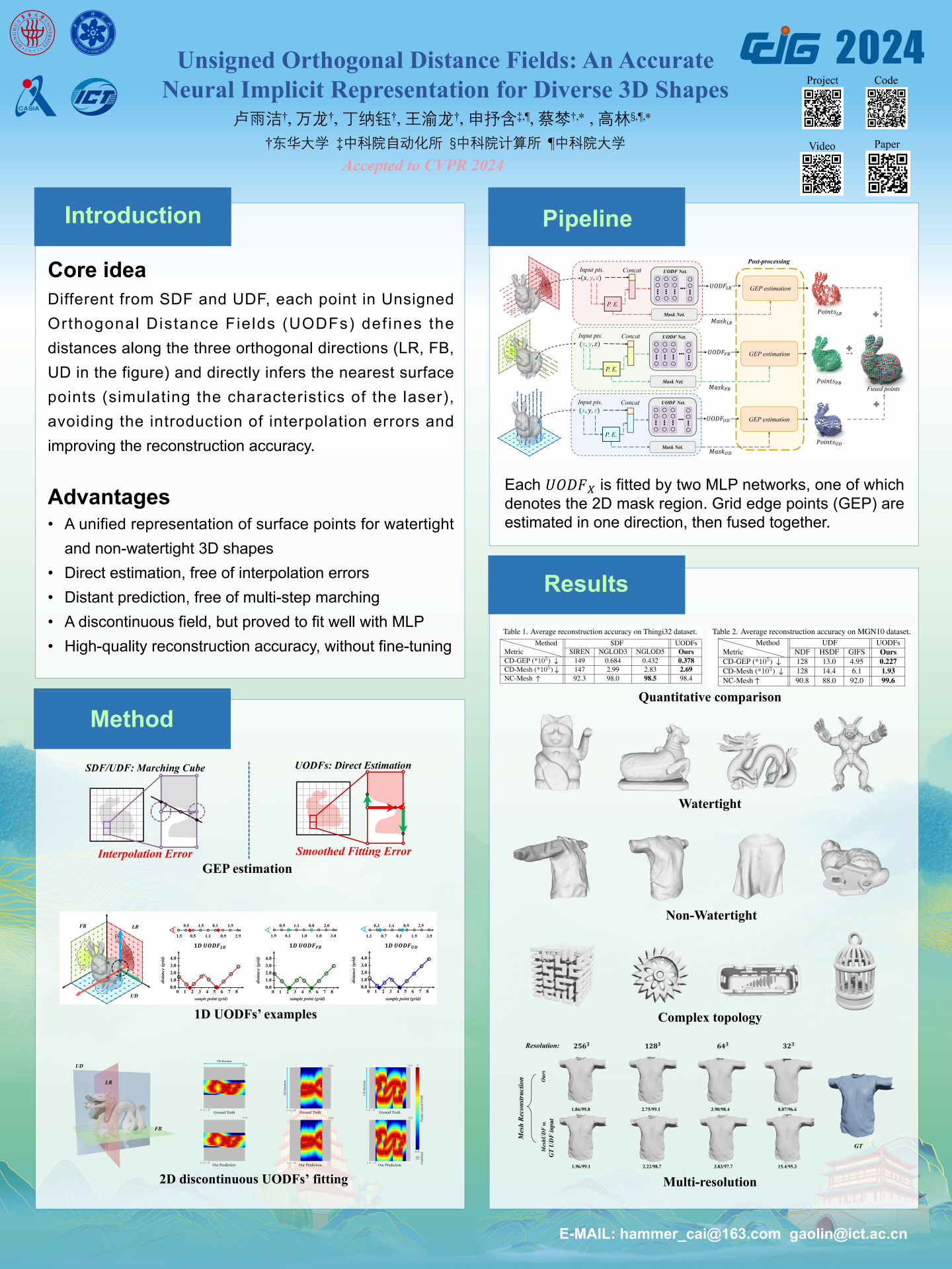 | P079 | Unsigned Orthogonal Distance Fields: An Accurate Neural Implicit Representation for Diverse 3D Shapes | 卢雨洁、万龙、丁纳钰、王渝龙、申抒含、蔡棽、高林 | CVPR | 查看 |