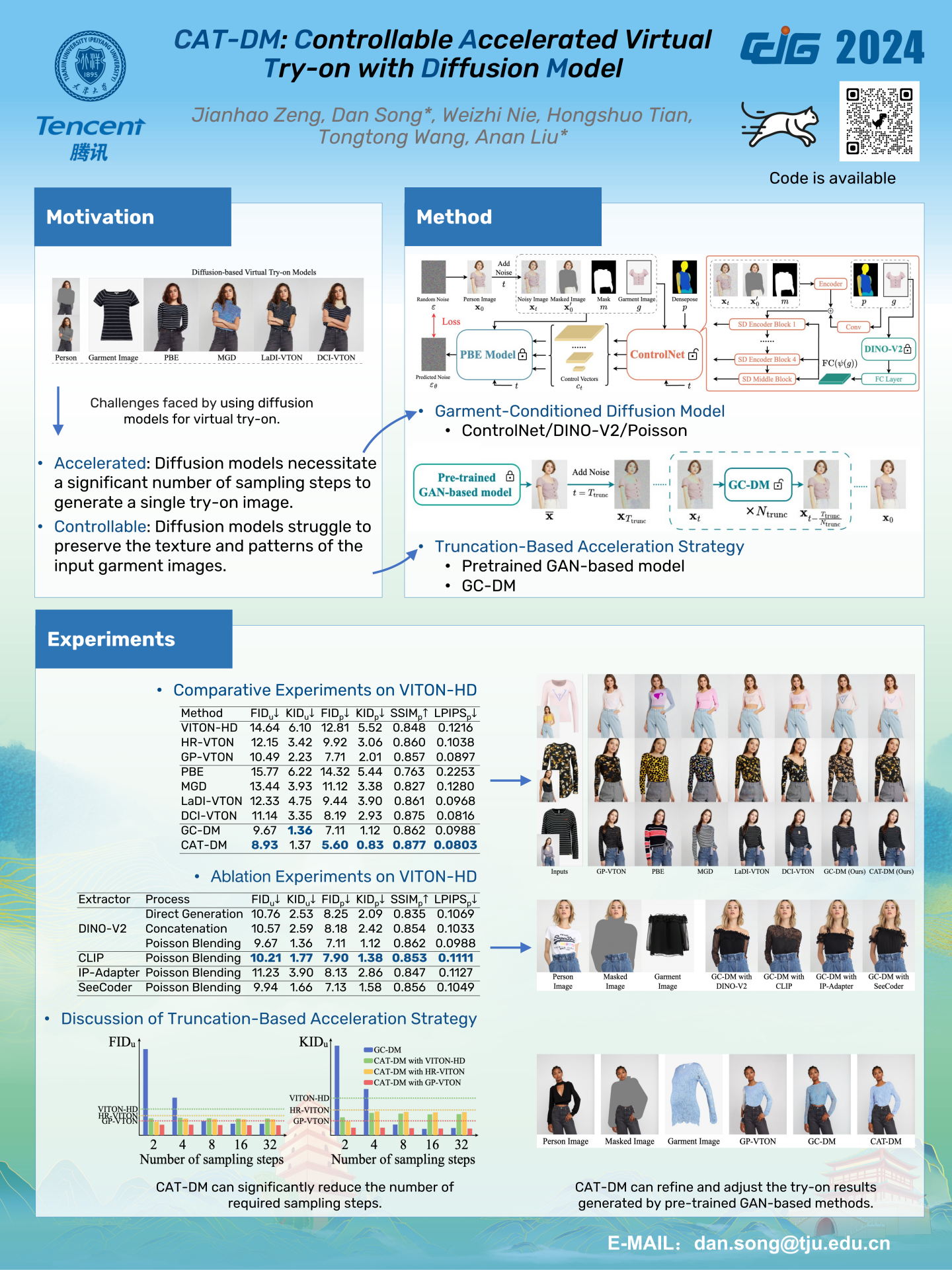 | P008 | CAT-DM: Controllable Accelerated Virtual Try-on with Diffusion Model | 曾建豪、宋丹、聂为之、田宏硕、王彤彤、刘安安 | CVPR | 查看 |