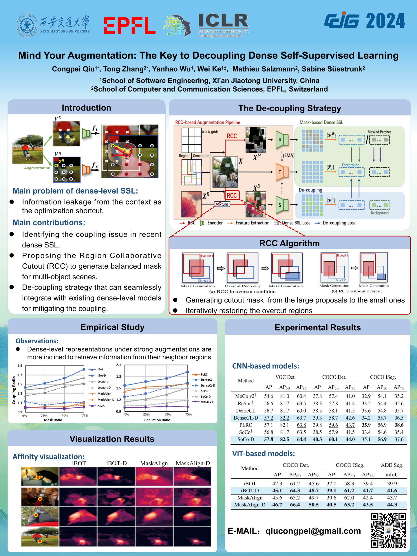 | P080 | Mind Your Augmentation: The Key to Decoupling Dense Self-Supervised Learning | 丘琮培、张同、伍彦豪、柯炜、Mathieu Salzmann、Sabine Süsstrunk | ICLR | 查看 |