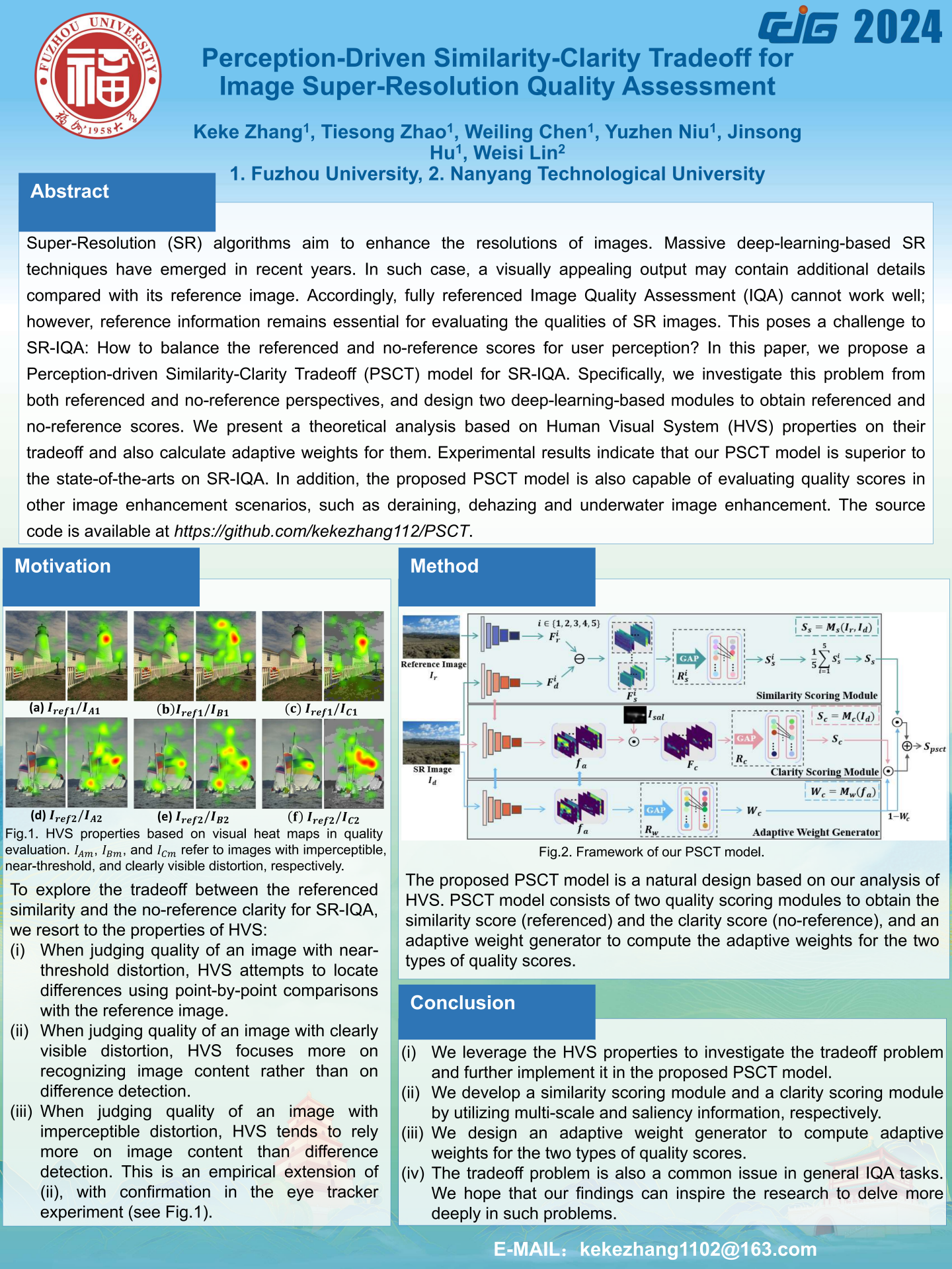 | P083 | Perception-Driven Similarity-Clarity Tradeoff for Image Super-Resolution Quality Assessment | 张可可、赵铁松、陈炜玲、牛玉贞、胡锦松、林维斯 | IEEE TCSVT | 查看 |