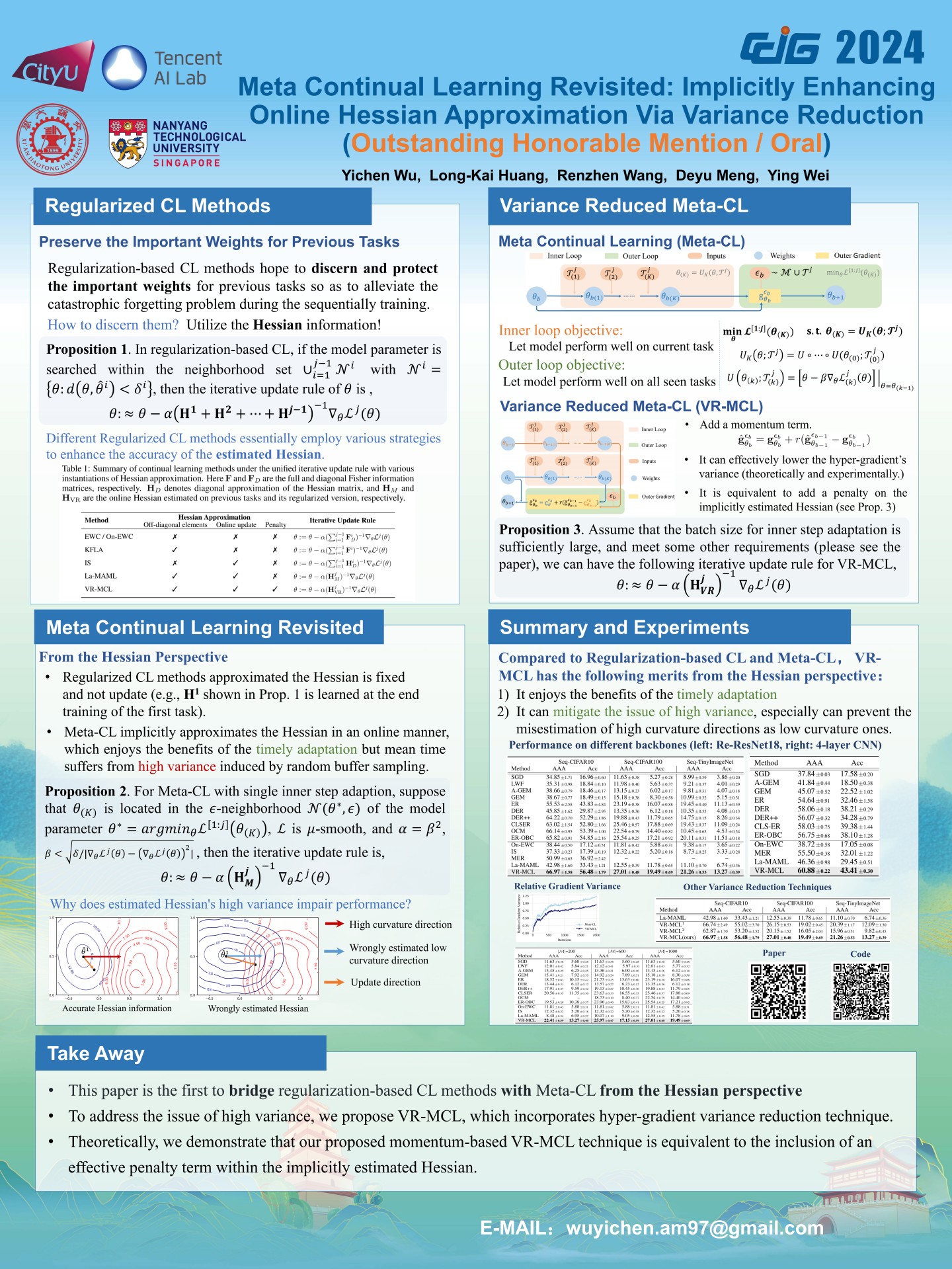 | P084 | Meta Continual Learning Revisited: Implicitly Enhancing Hessian Online Hessian Approximation via Variance Reduction | 吴一尘, 黄隆锴, 王仁振, 孟德宇, 魏颖 | ICLR | 查看 |
